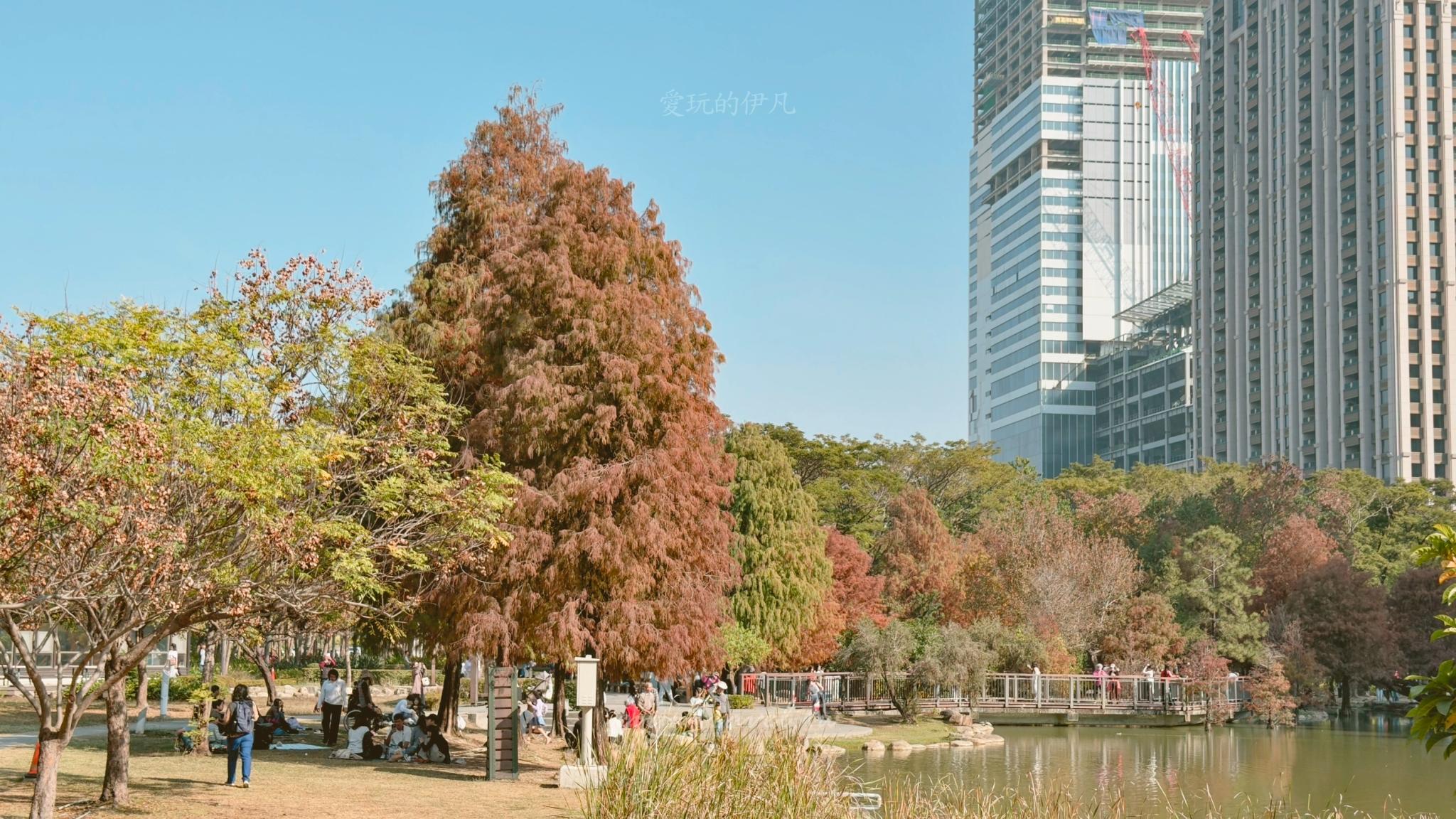 凹子底森林公園最大的特色,就是它完美的融合了「自然生態」與「城市景觀」。站在生態鳥巢拱橋上望去,眼前是轉紅的落羽松與波光粼粼的湖水,背景卻是高雄豪宅區的高聳建築,這種強烈的對比反而有一種現代與自然共存的獨特美感。