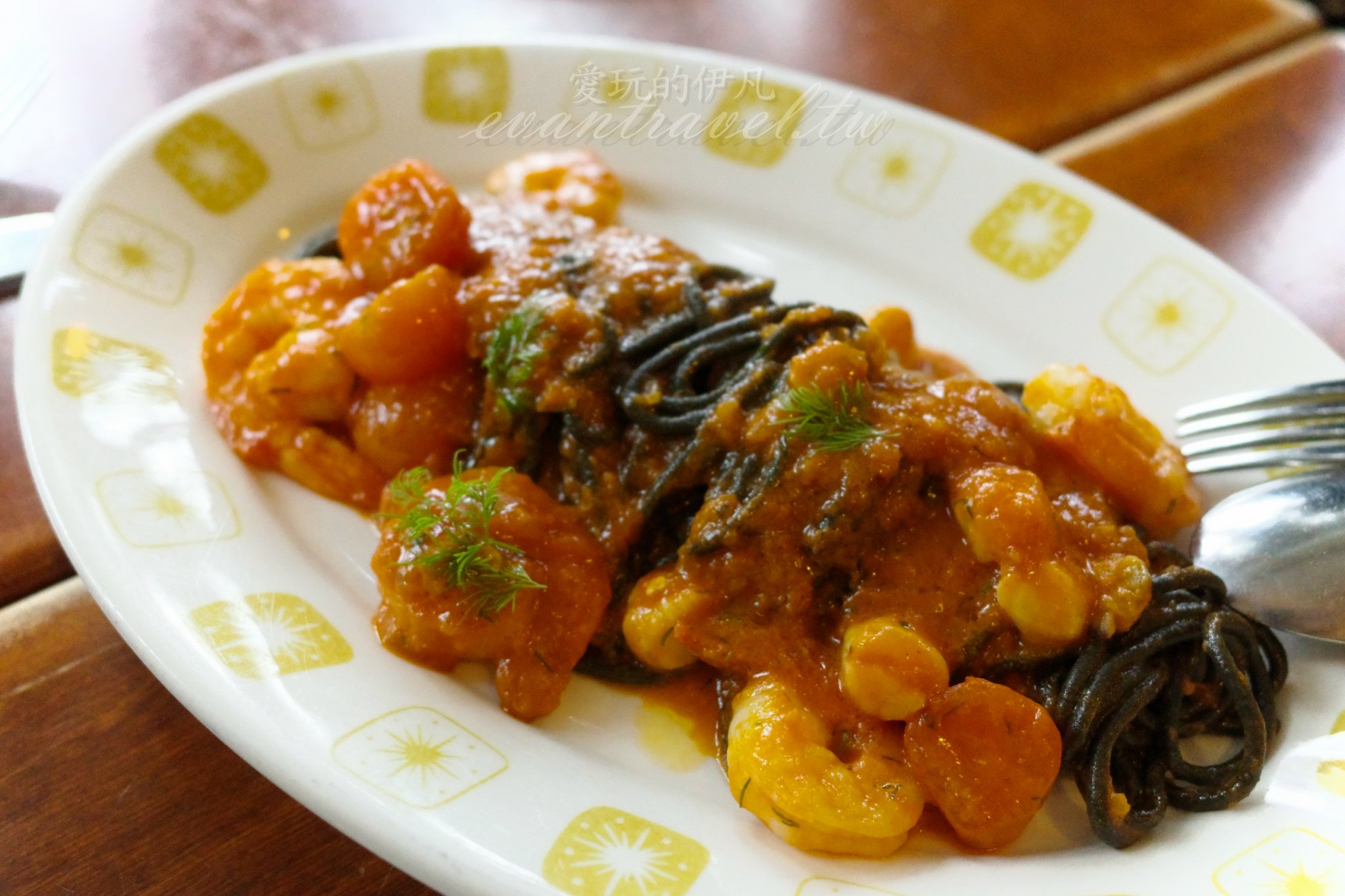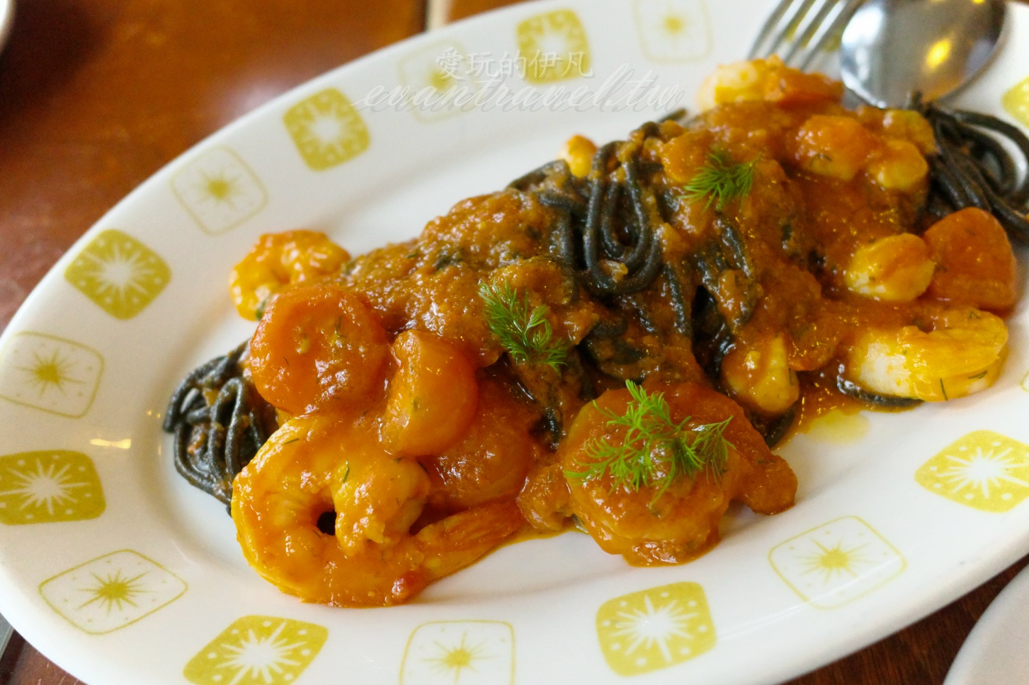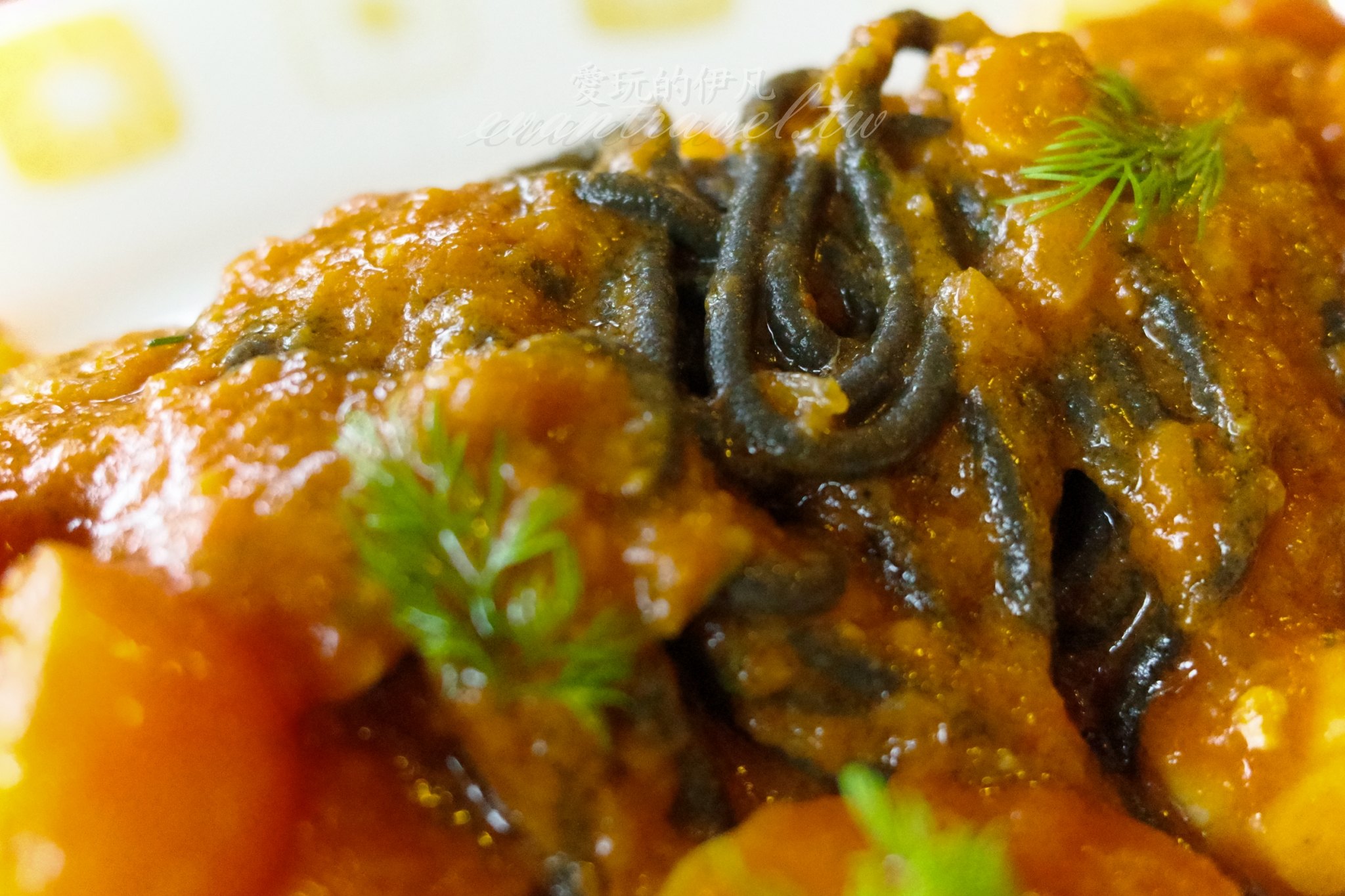 這款黑色墨魚汁手工麵體(Bigoli)咬勁十足,能吃到麵粉的筋道與墨魚的香氣,搭配辛辣帶勁的憤怒醬(Arrabiata),紅黑對比的視覺效果極佳,每一口都充滿了義式的熱情火辣。