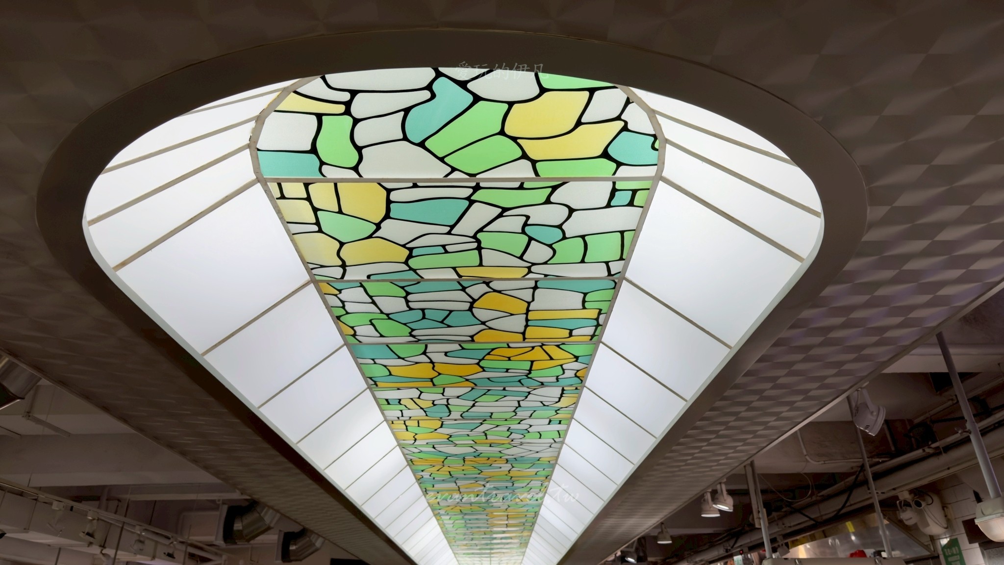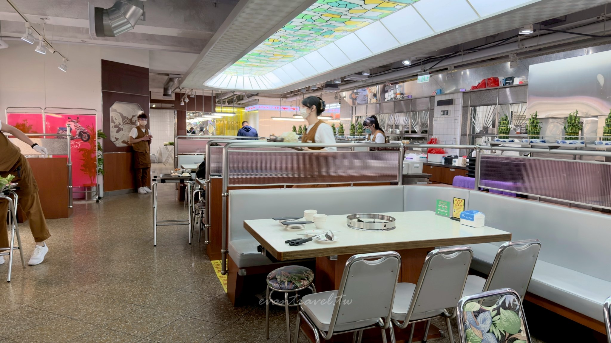 店內裝潢完全復刻了 90 年代的風貌:復古的磁磚牆、懷舊的白底紅字瓷盤,以及頭頂那片瑰麗奪目的彩繪玻璃天花板,在昏黃柔和的燈光下,營造出一種既時髦又充滿底蘊的用餐感。雖然環境主打復古,但點餐流程卻非常現代,透過 QR Code 掃碼點餐,送餐速度俐落,服務非常有水準。