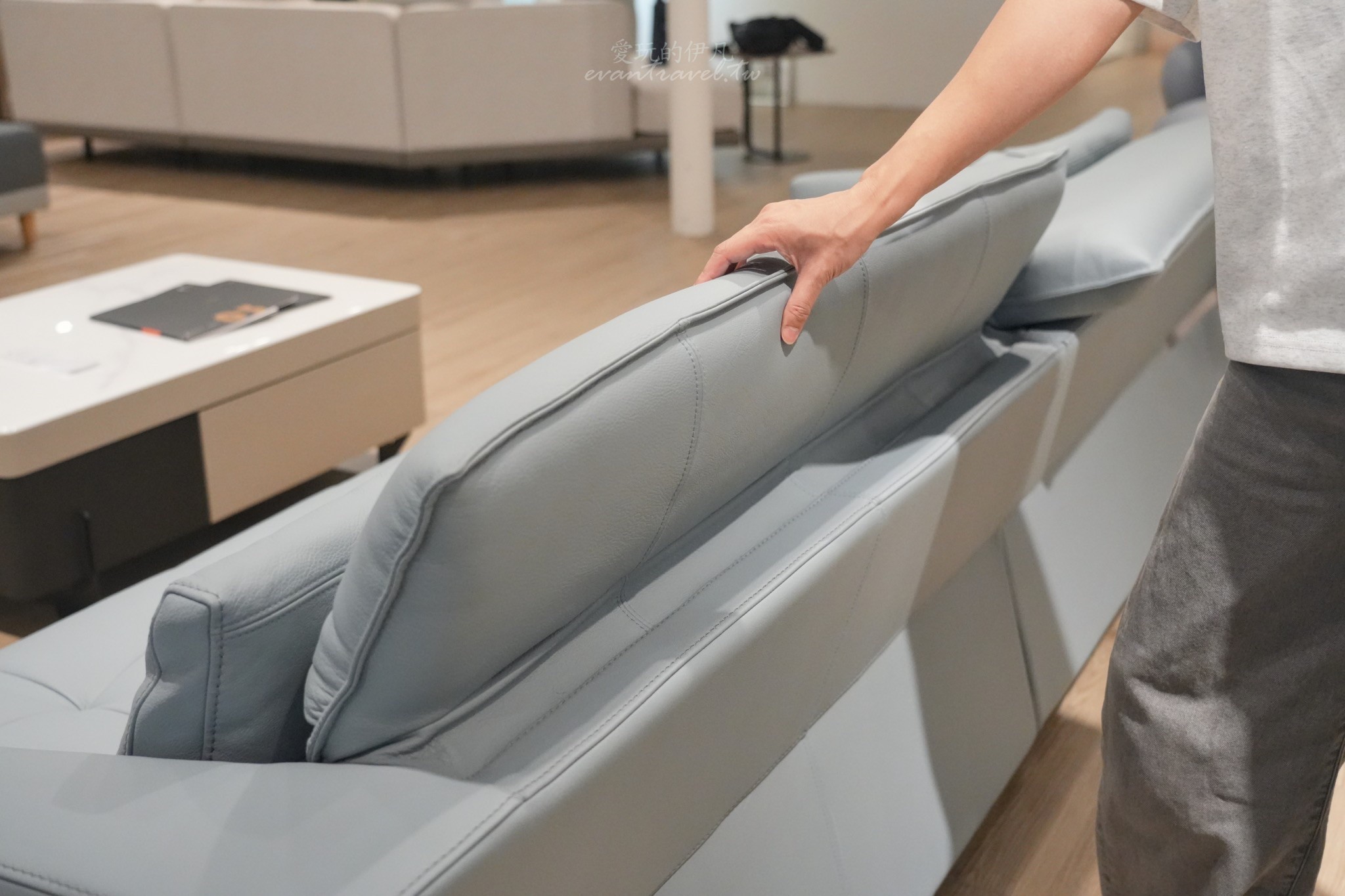 這款沙發最厲害的是它的「五金結構」。背部搭配日本進口五金,可以多段調整角度。這對我這種長時間坐在客廳的人來說太重要了,想專心剪片時調挺一點,想看 Netflix 時調斜一點,隨心所欲。扶手造型由後寬前窄,展現大器視覺比例,前端還有拉鍊裝飾的小巧思。這是一張兼具美感與實用性的質感沙發。