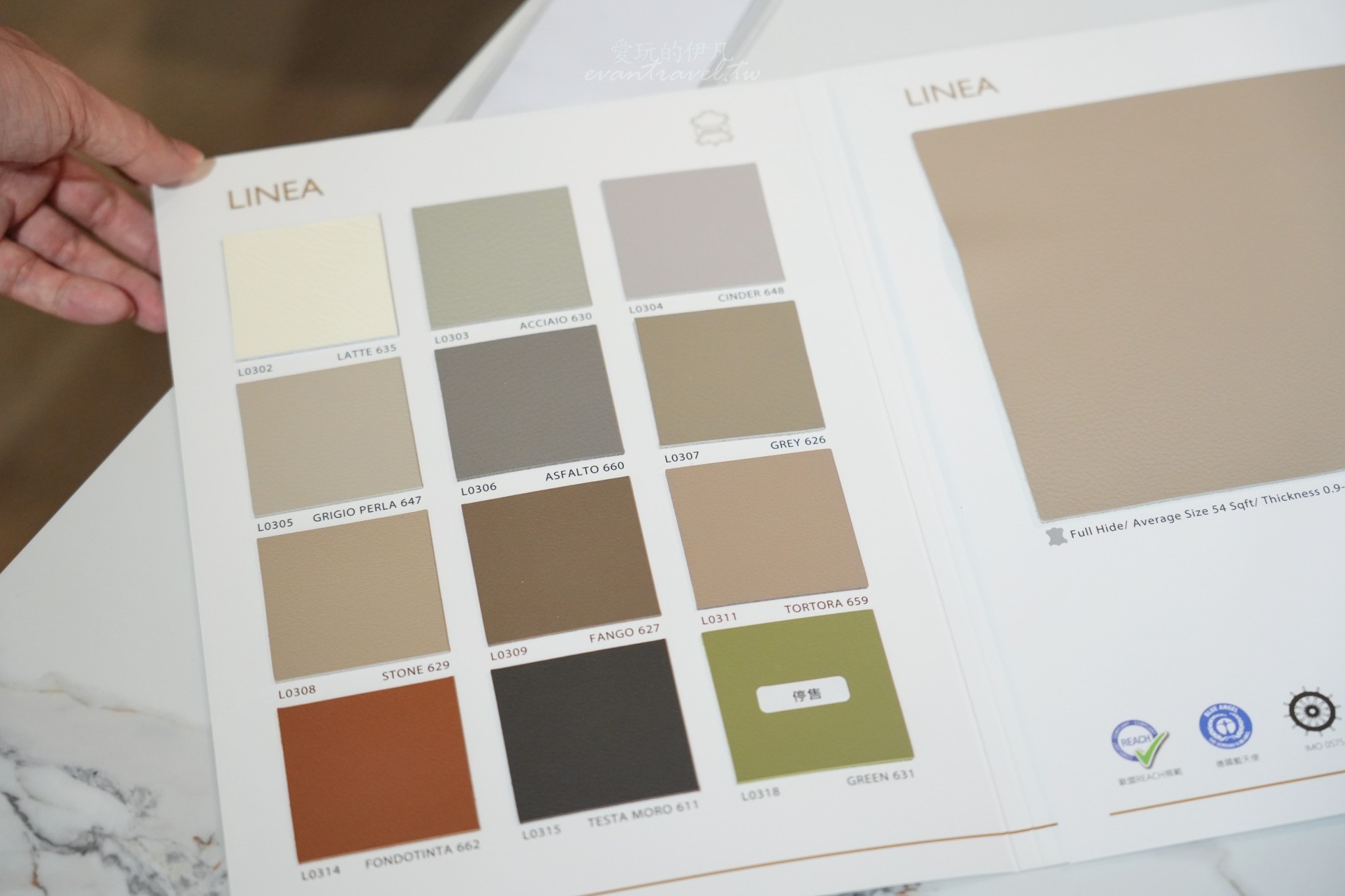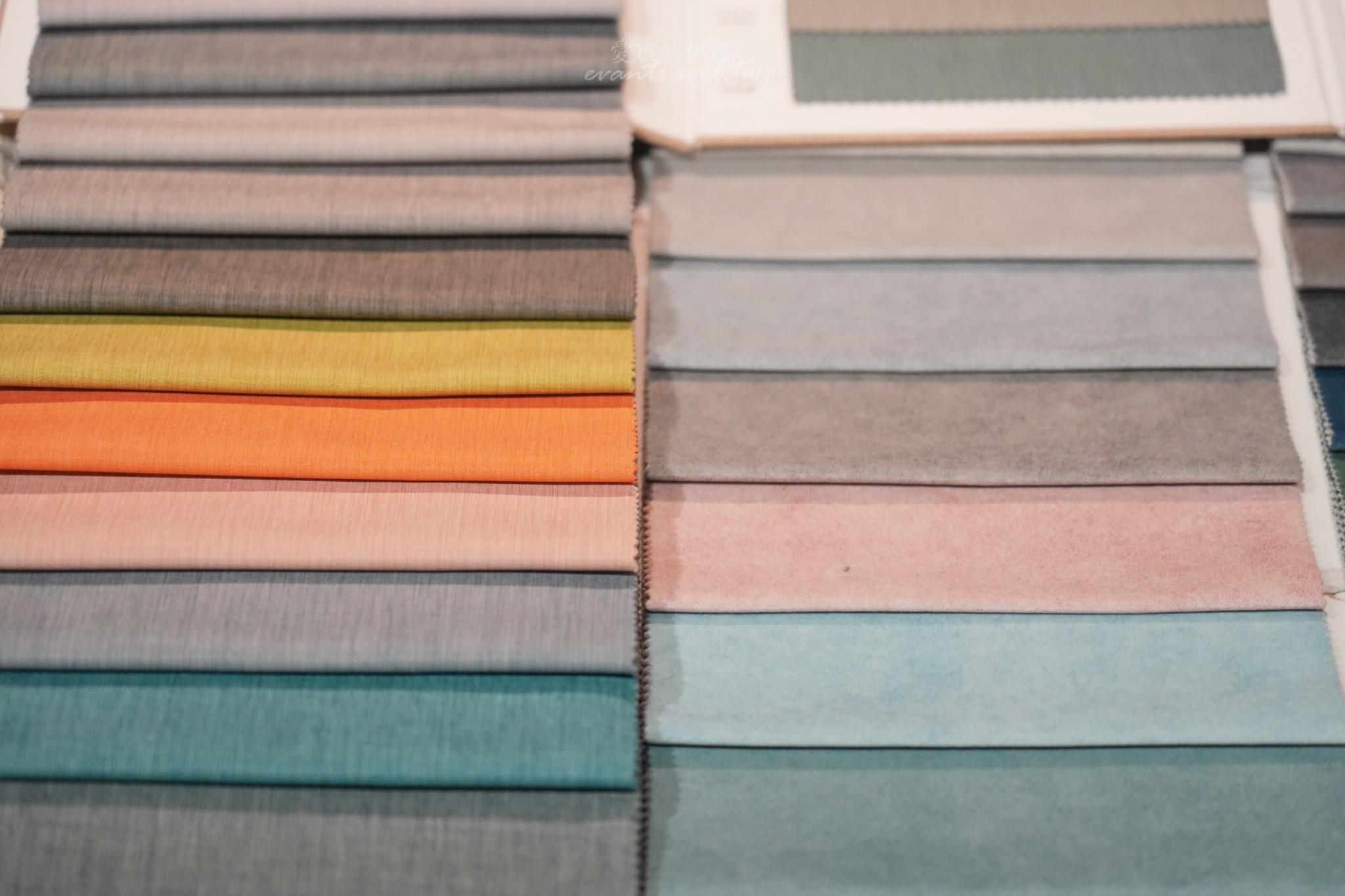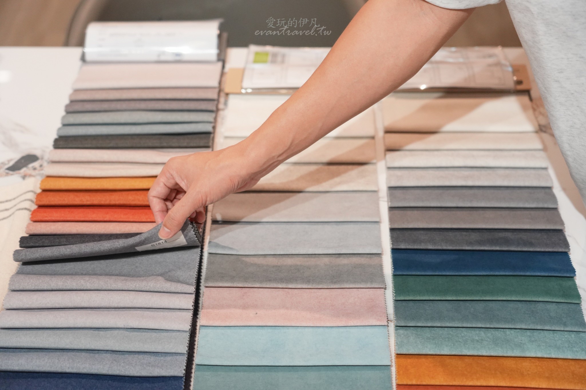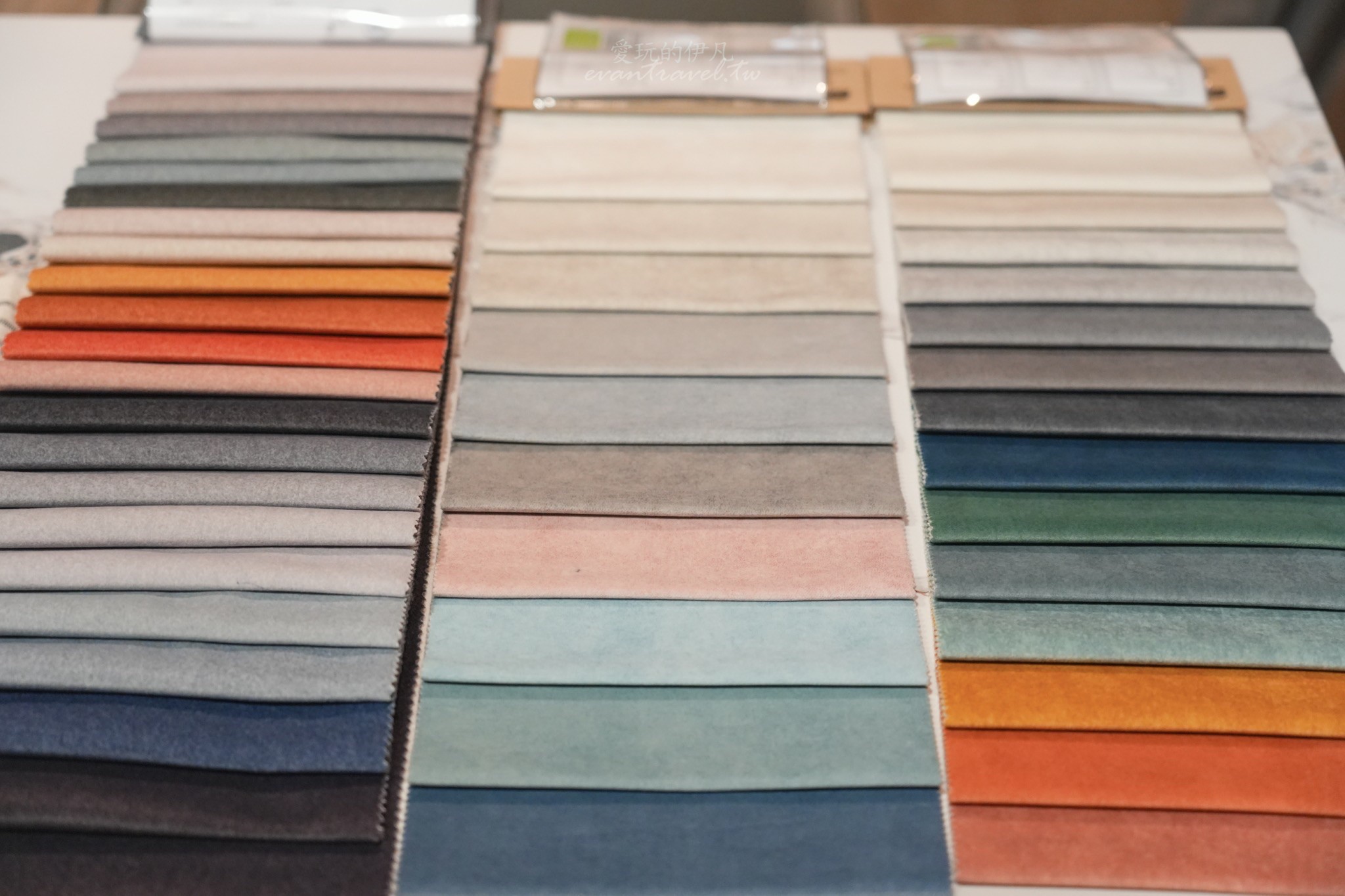 身為部落客,我很在意家裡的視覺風格統一。在所丘,幾乎所有沙發的尺寸、布料、顏色都可以調整。現場有整面牆的布版皮版可以挑選,像我常要拍開箱或是食物,如果不小心弄髒很麻煩,業務專員就推薦我選擇好清潔、抗污的「貓抓布」系列;如果你怕熱,也有涼感布可以選。