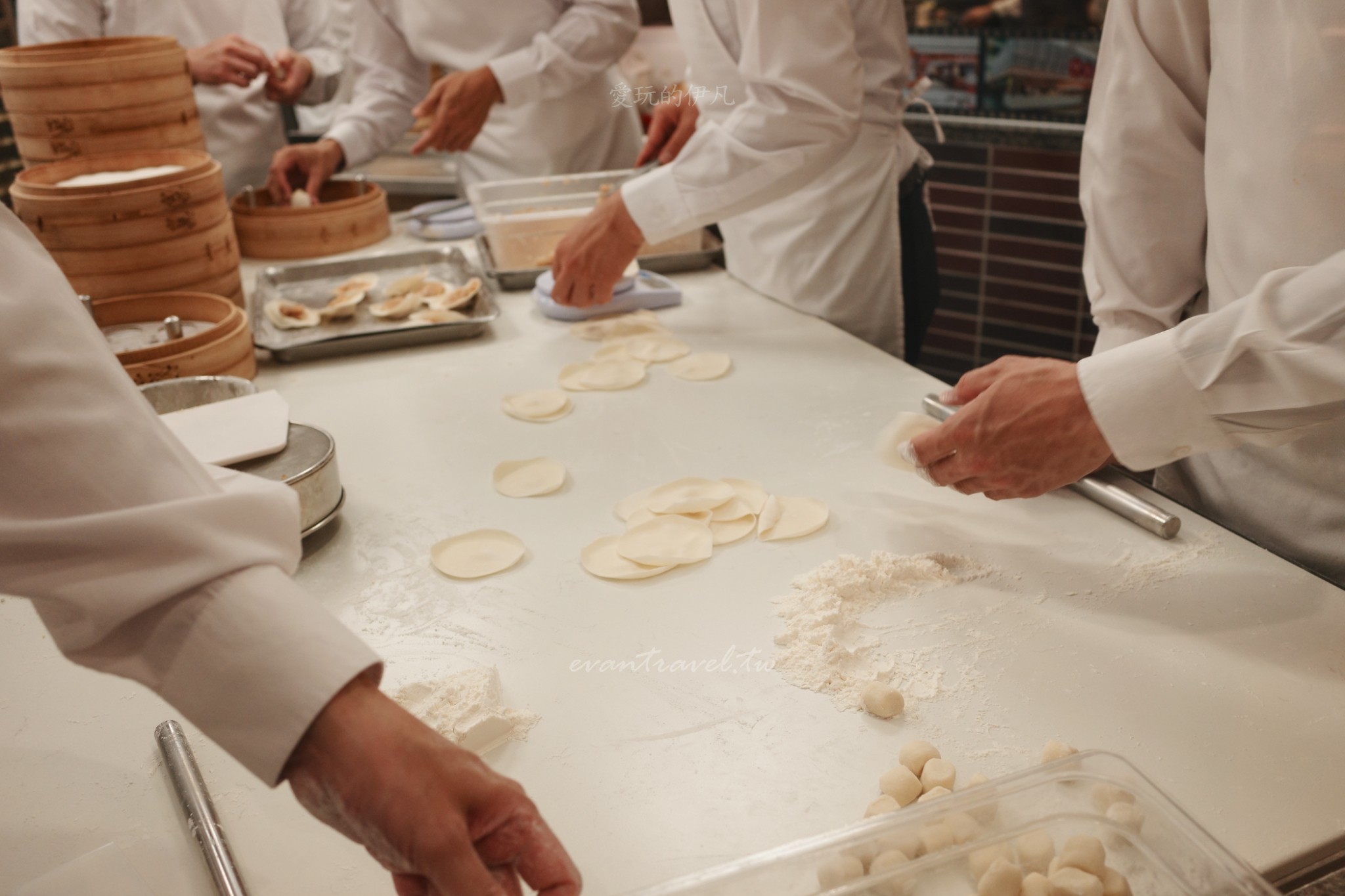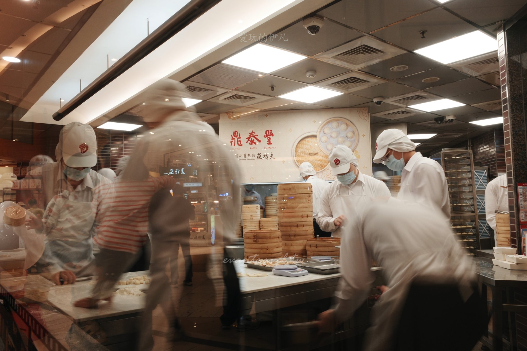 透明化廚房 (Show Kitchen):這是鼎泰豐最有名的標誌,數十位師傅穿著全套白衣戴著口罩,熟練地在玻璃後擀皮、包餡、捏出黃金 18 折。那種整齊劃一的節奏感,簡直是視覺饗宴。