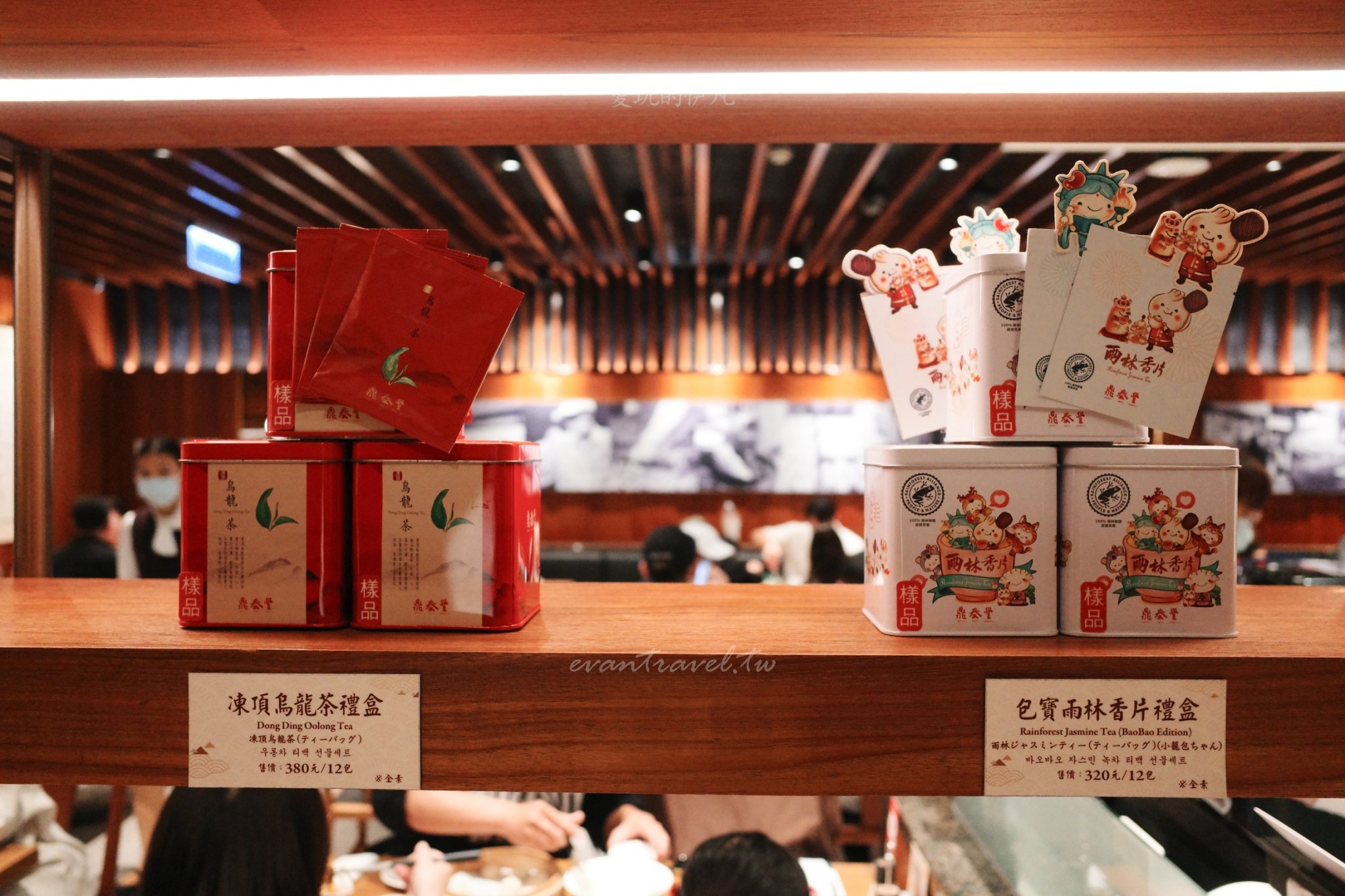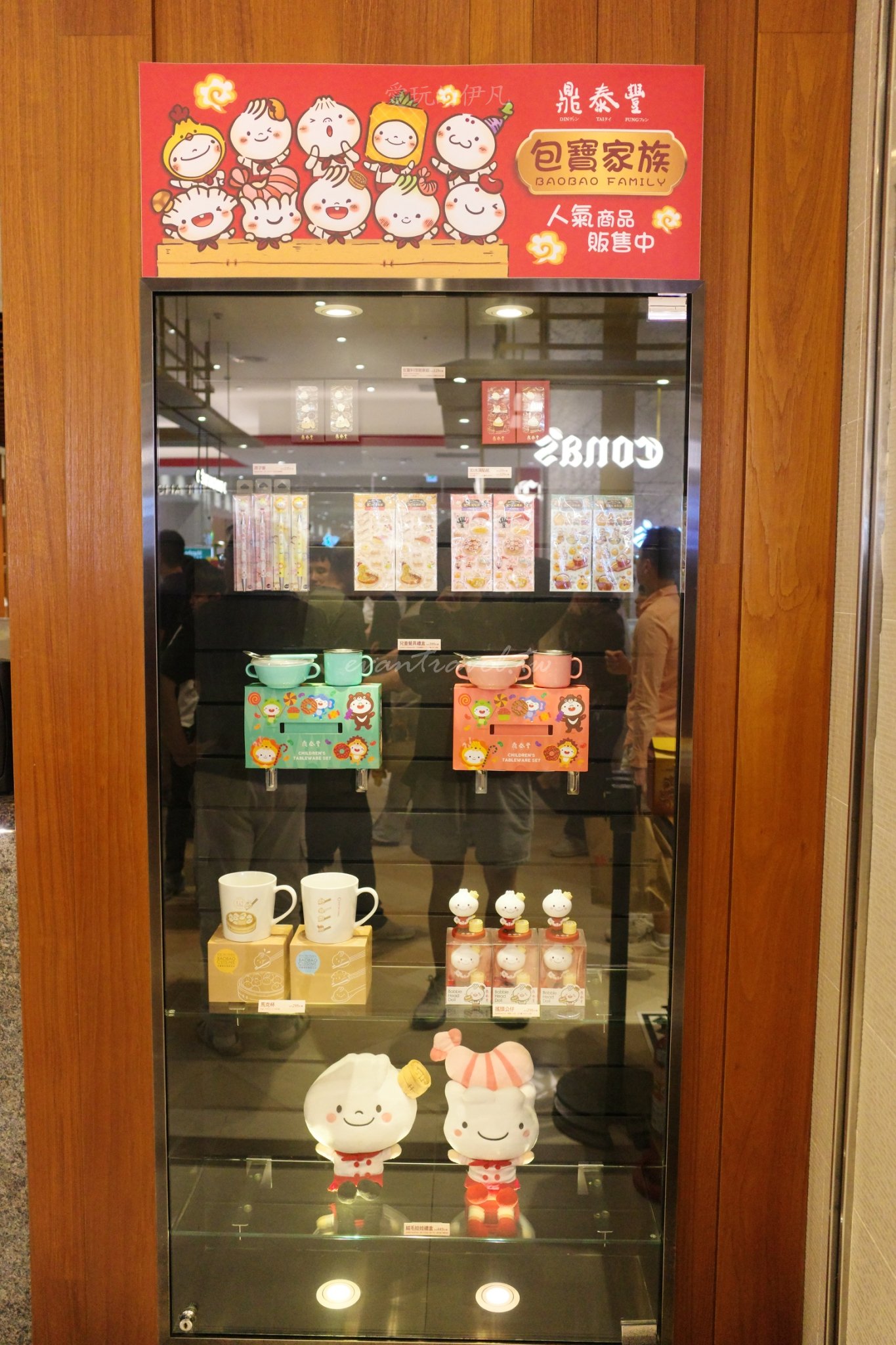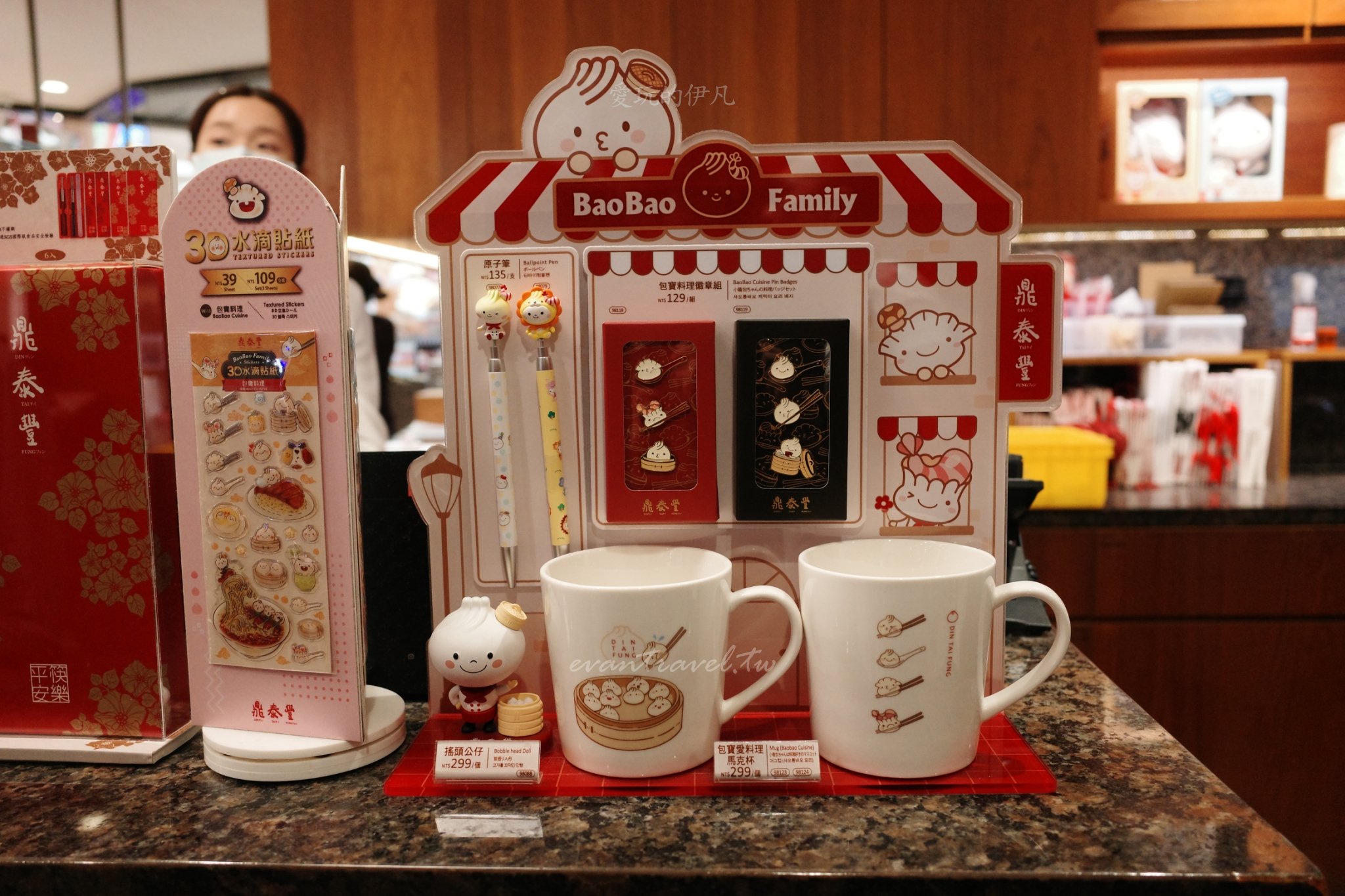 品牌周邊與包寶家族:櫃檯旁展示了許多可愛的 BaoBao Family 商品,從 3D 水滴貼紙、原子筆到搖頭公仔,甚至還有精緻的烏龍茶禮盒。