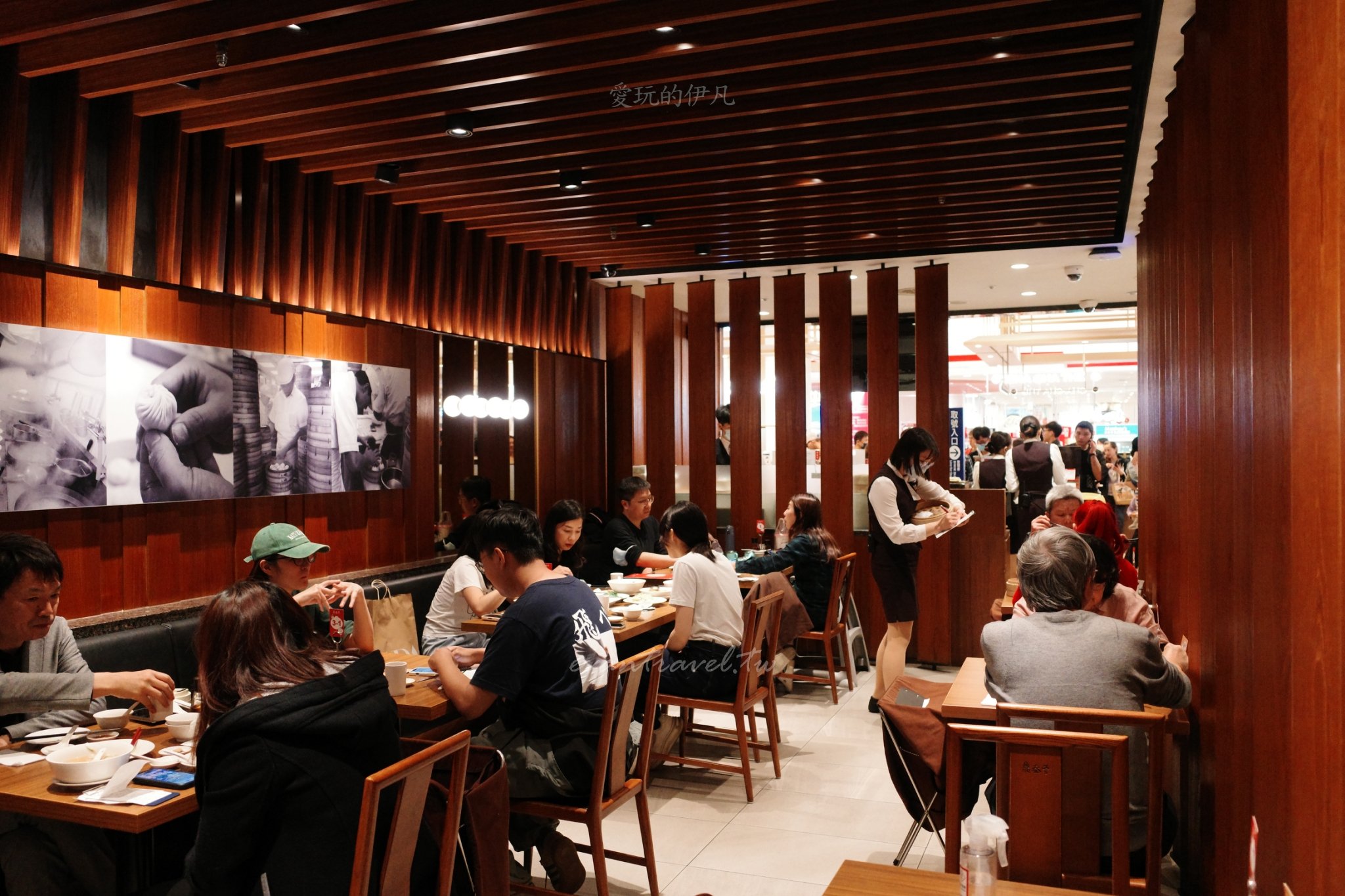 典雅用餐區:店內採用溫潤的木質裝潢,牆上掛著優雅的藝術作品,甚至連木椅背上都精緻地刻著「鼎泰豐」三個字。空間寬敞且動線流暢,即便是尖峰時段也不顯擁擠。