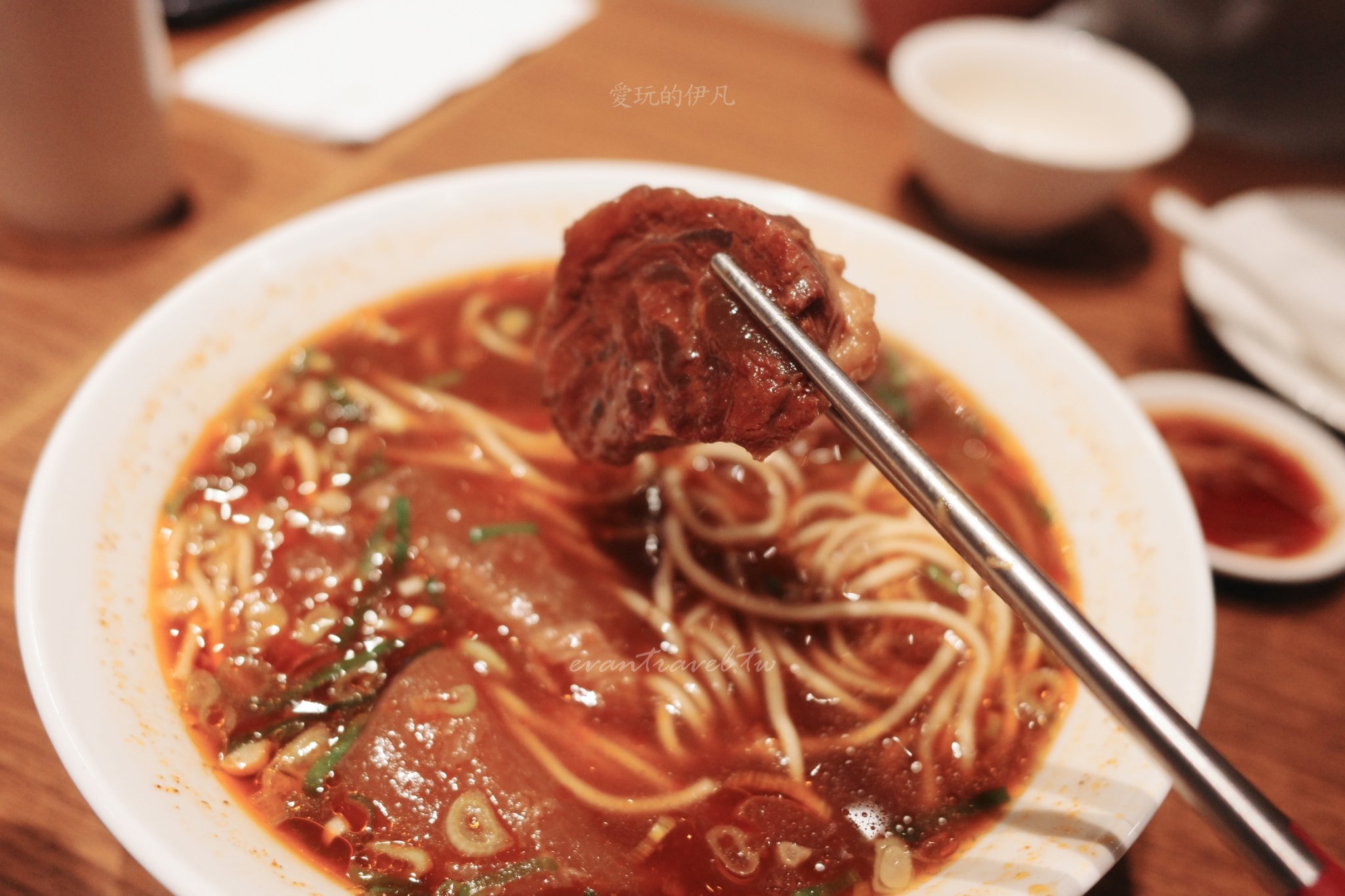 湯頭濃郁帶著微辣,半筋半肉的組合處理得極為完美,牛肉輕抿即化,麵條亦具韌性。