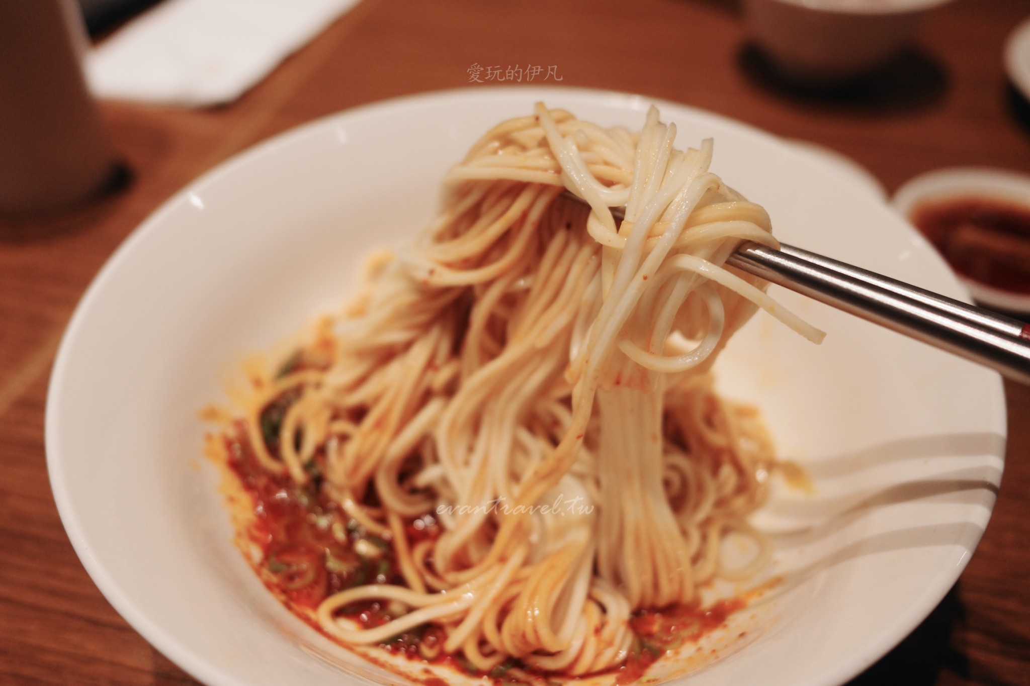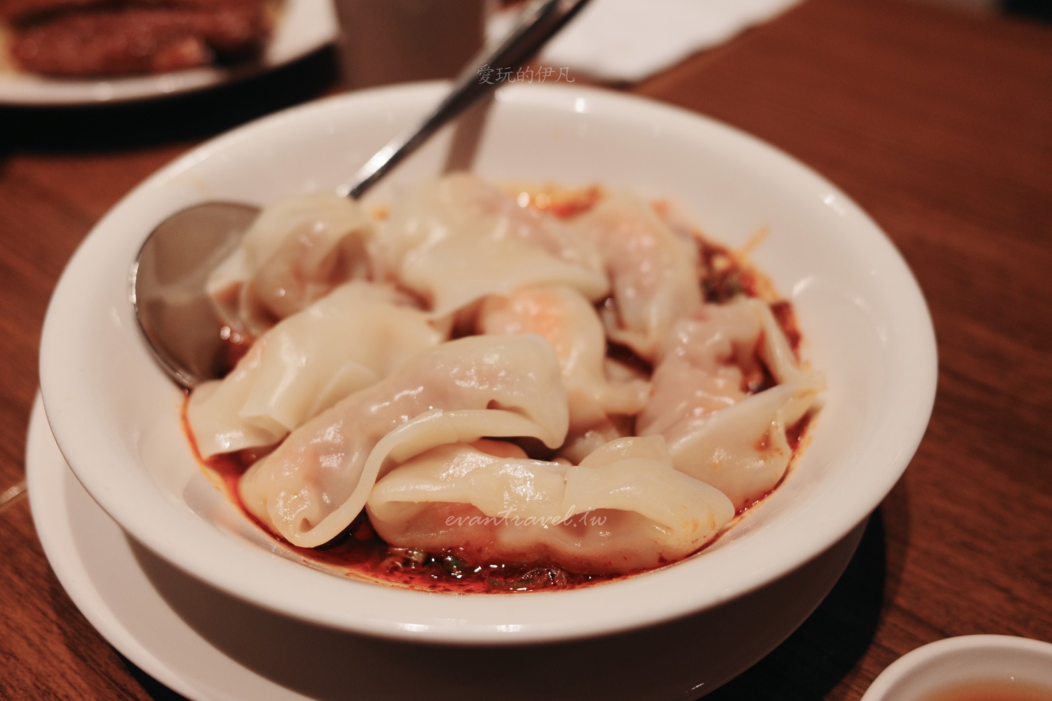 伊凡私心最愛!那鮮紅透亮的紅油醬汁,帶點醋酸與椒香,與飽滿的蝦肉抄手拌在一起簡直無敵。