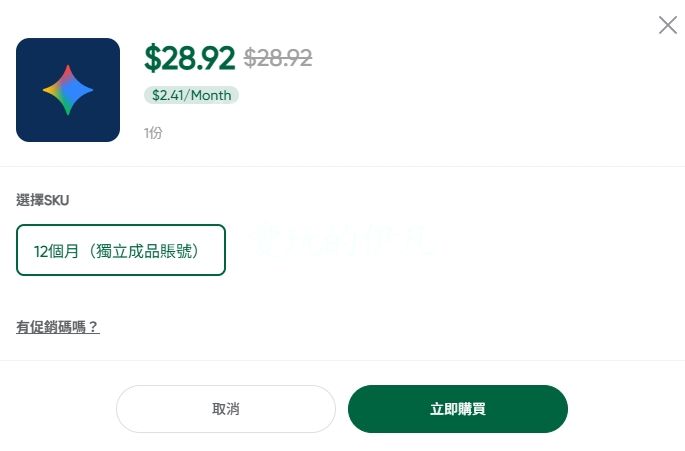 1. 選擇規格: 點選「12個月(獨立成品帳號)」。可以看到原價是 $28.92 美金,換算下來一個月才 $2.41 美金。