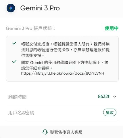 1. 你會看到 Gemini 3 Pro 的狀態顯示**「使用中」**,並顯示剩餘時間(約 8600 多小時,即一年)。