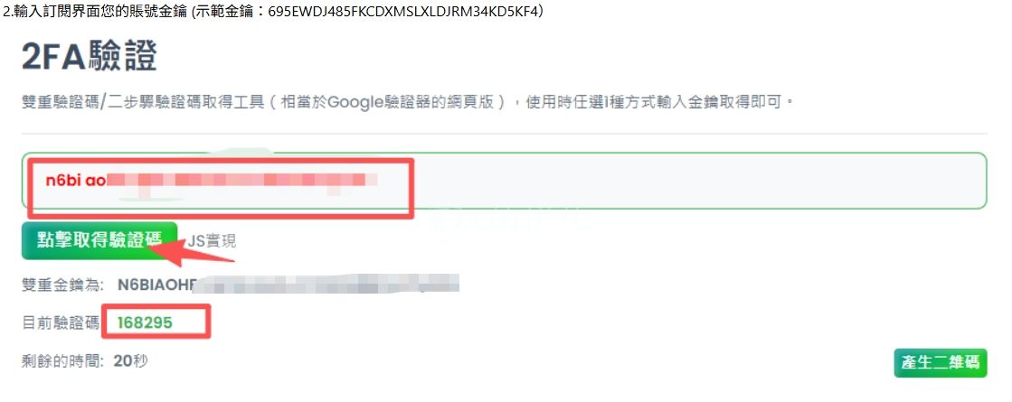 4. 輸入密鑰: 回到 FlixSeek 後台複製那串紅色的「密鑰」,貼到 2FA 網站的框框內。