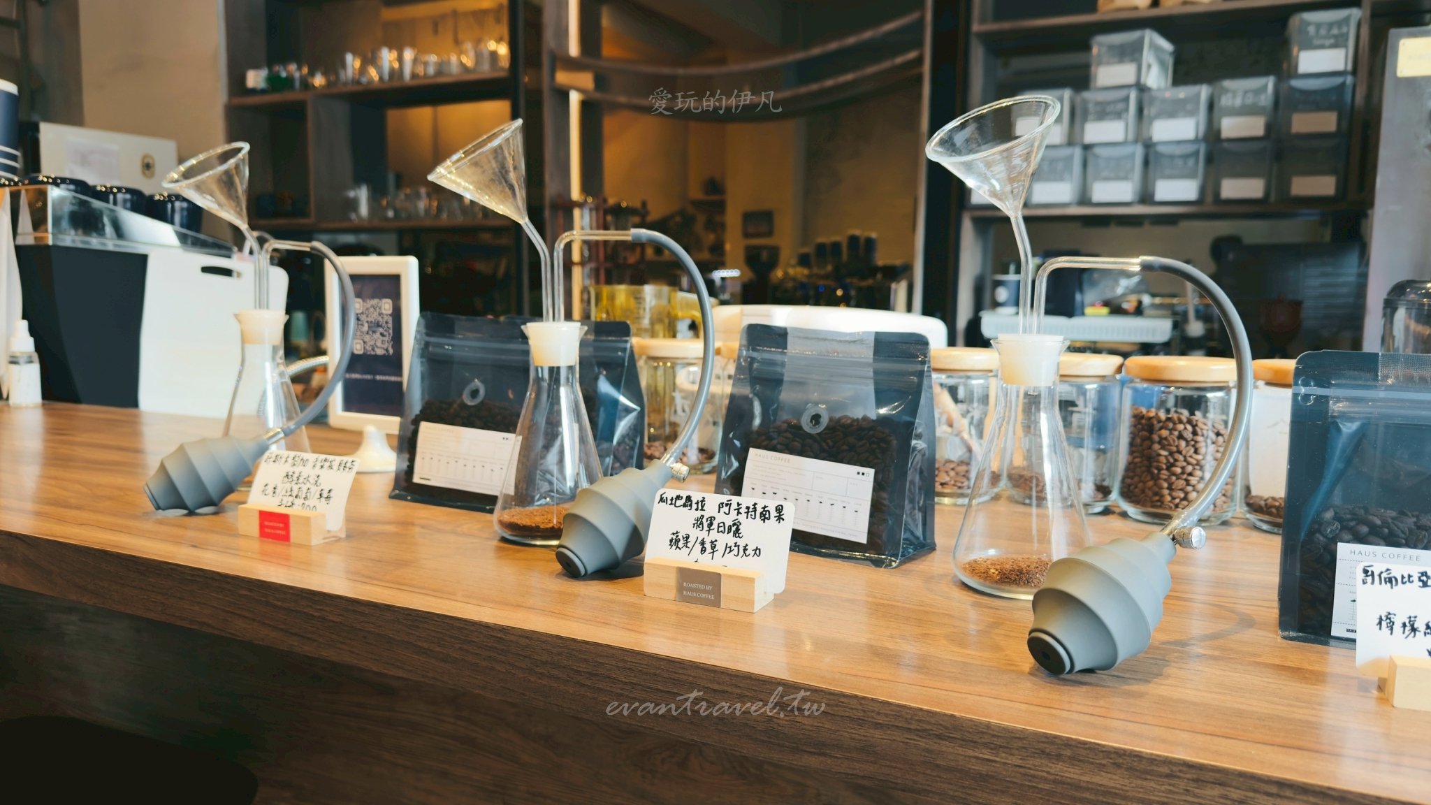特別吸睛的是這一整排充滿實驗室風格的虹吸式咖啡壺 (Syphon) 和手沖器具,還有展示著不同風味的咖啡豆聞香瓶,光是看著就是一種視覺享受。