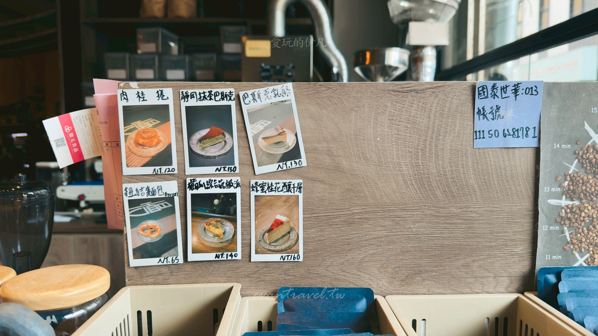 每日甜點看這裡! 最讓我驚喜的是櫃檯的甜點展示方式!店家將當日供應的甜點拍成一張張超可愛的「拍立得照片」貼在板子上,上面還手寫了品項名稱和價格。看著照片點餐直觀又有趣,每一款看起來都超誘人!除了招牌巴斯克,還有肉桂捲、鹹派和千層蛋糕。