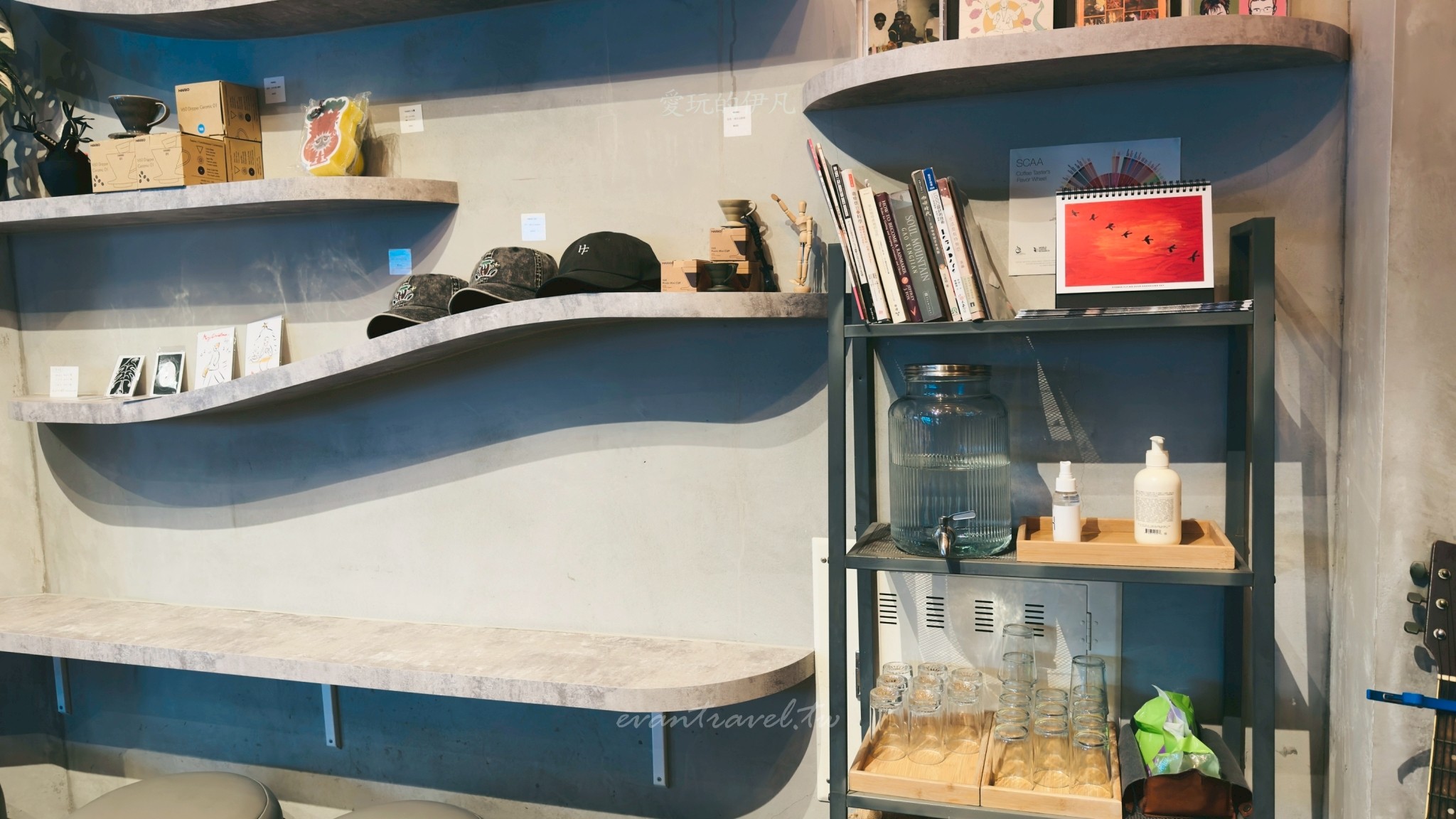 我非常喜歡那一面波浪造型的展示牆,上面擺放了許多咖啡選物、帽子和書籍,在冷冽的水泥牆上增添了不少生活感與文藝氣息。