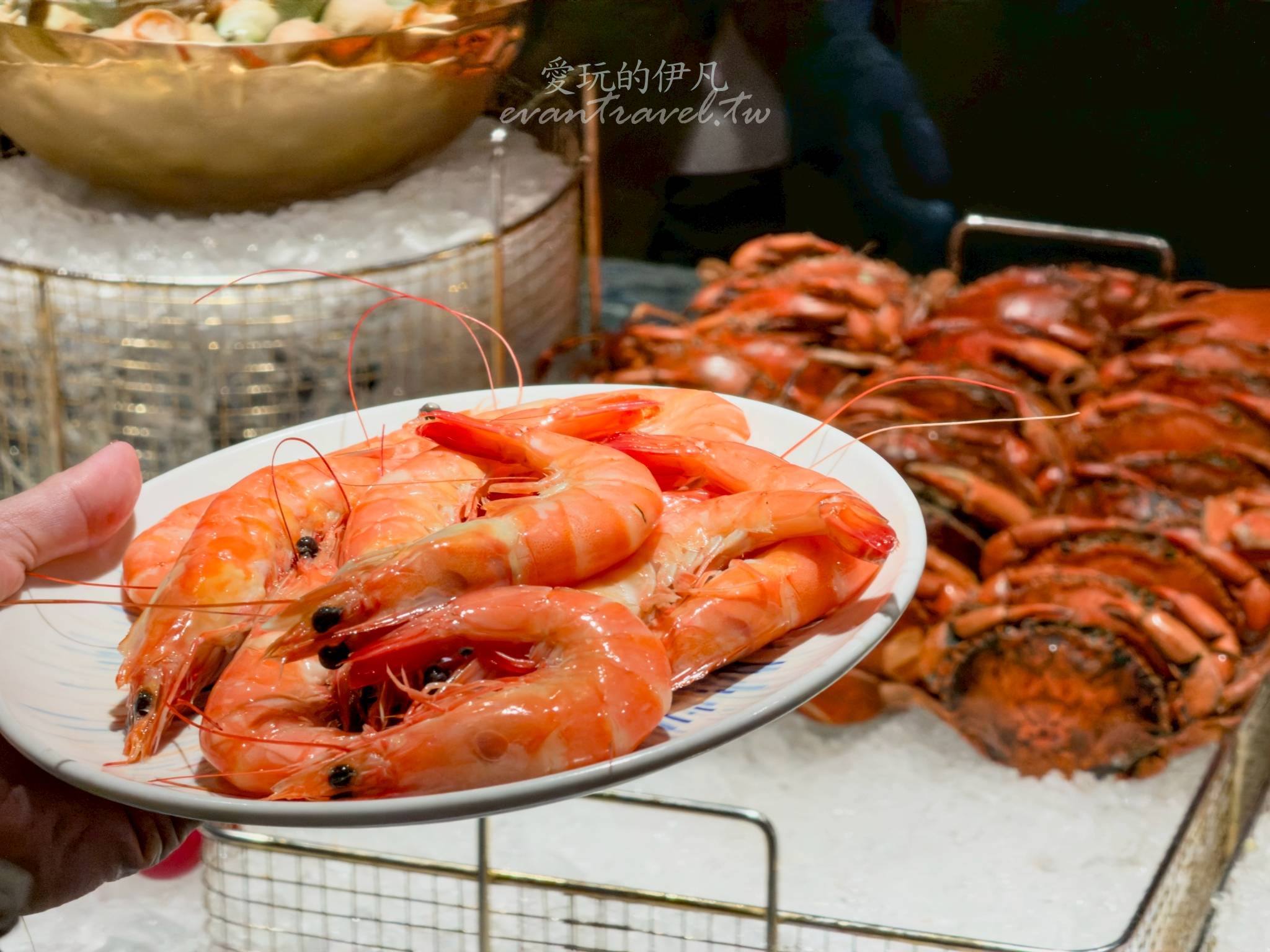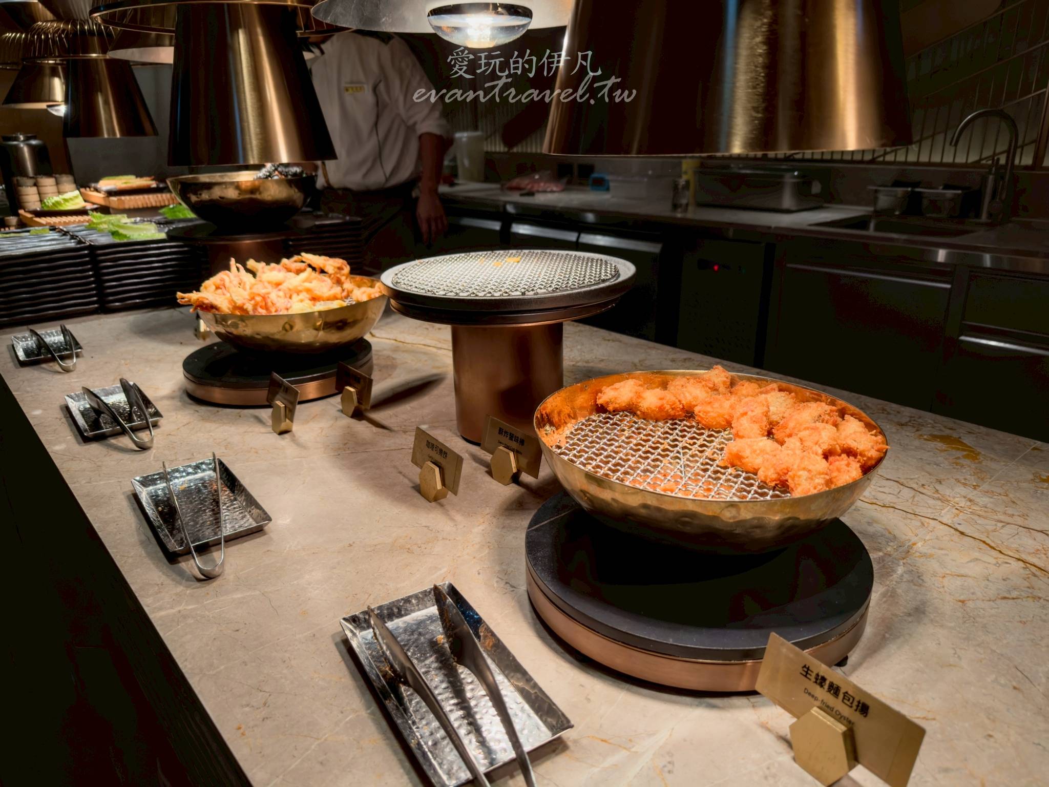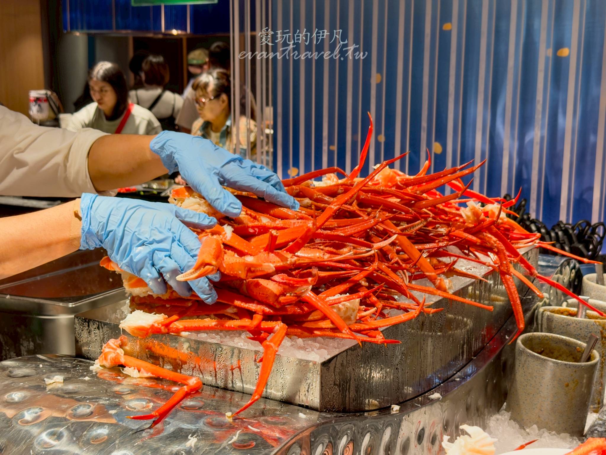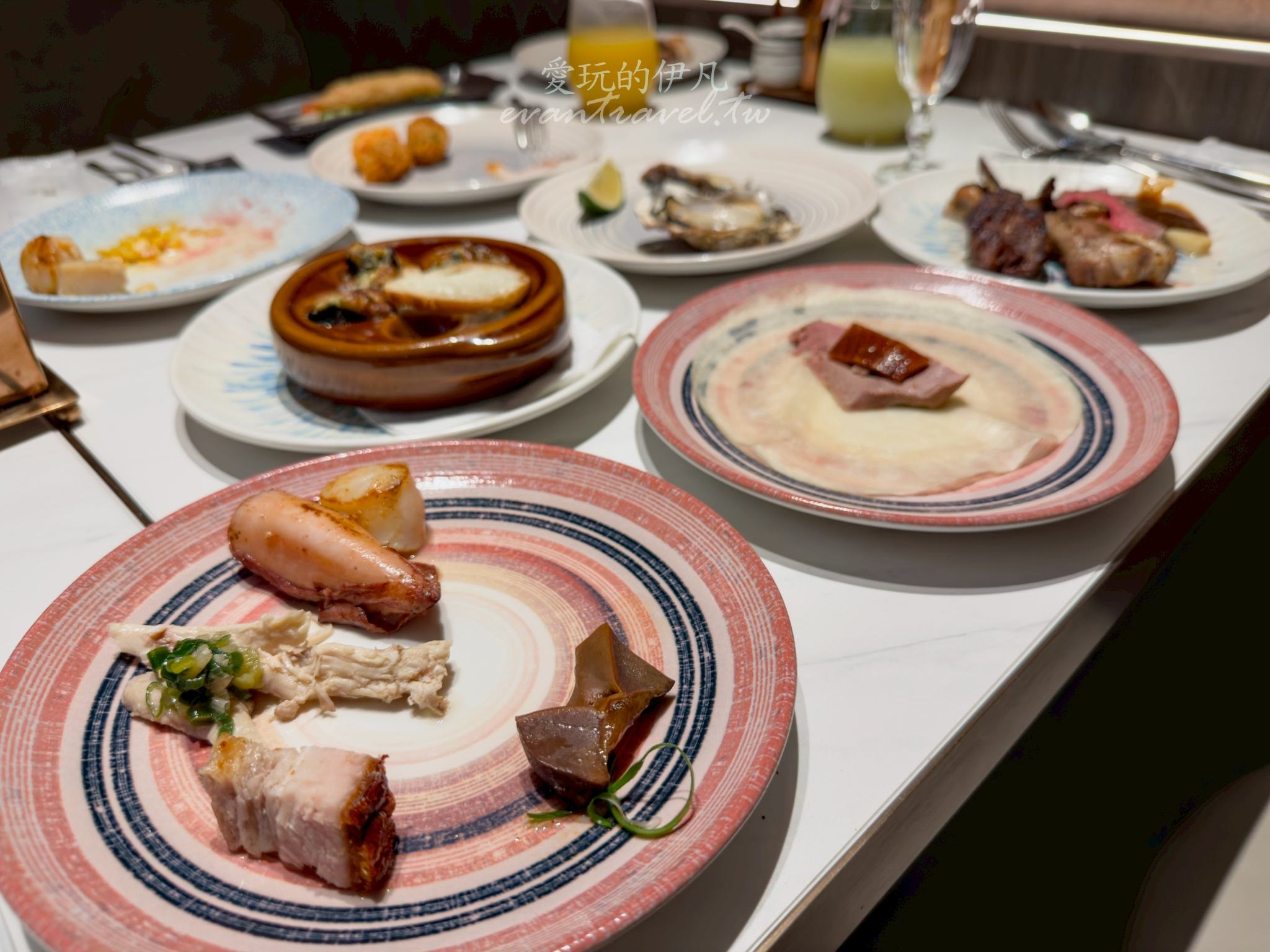 海鮮控的第一站一定是這裡。海鮮冰檯擺滿白蝦、雪場蟹腳、當季螃蟹,還出現一般 buffet 很少看到的法國海螺。冰鎮過後的鮮甜感非常明顯。旁邊還有鮮蔬沙拉區,提供在地小農生菜、產銷履歷水果,加上一整支現切帕瑪火腿、松露肝醬、波特葡萄肝醬,搭配冰白酒或氣泡飲開胃效果極佳。