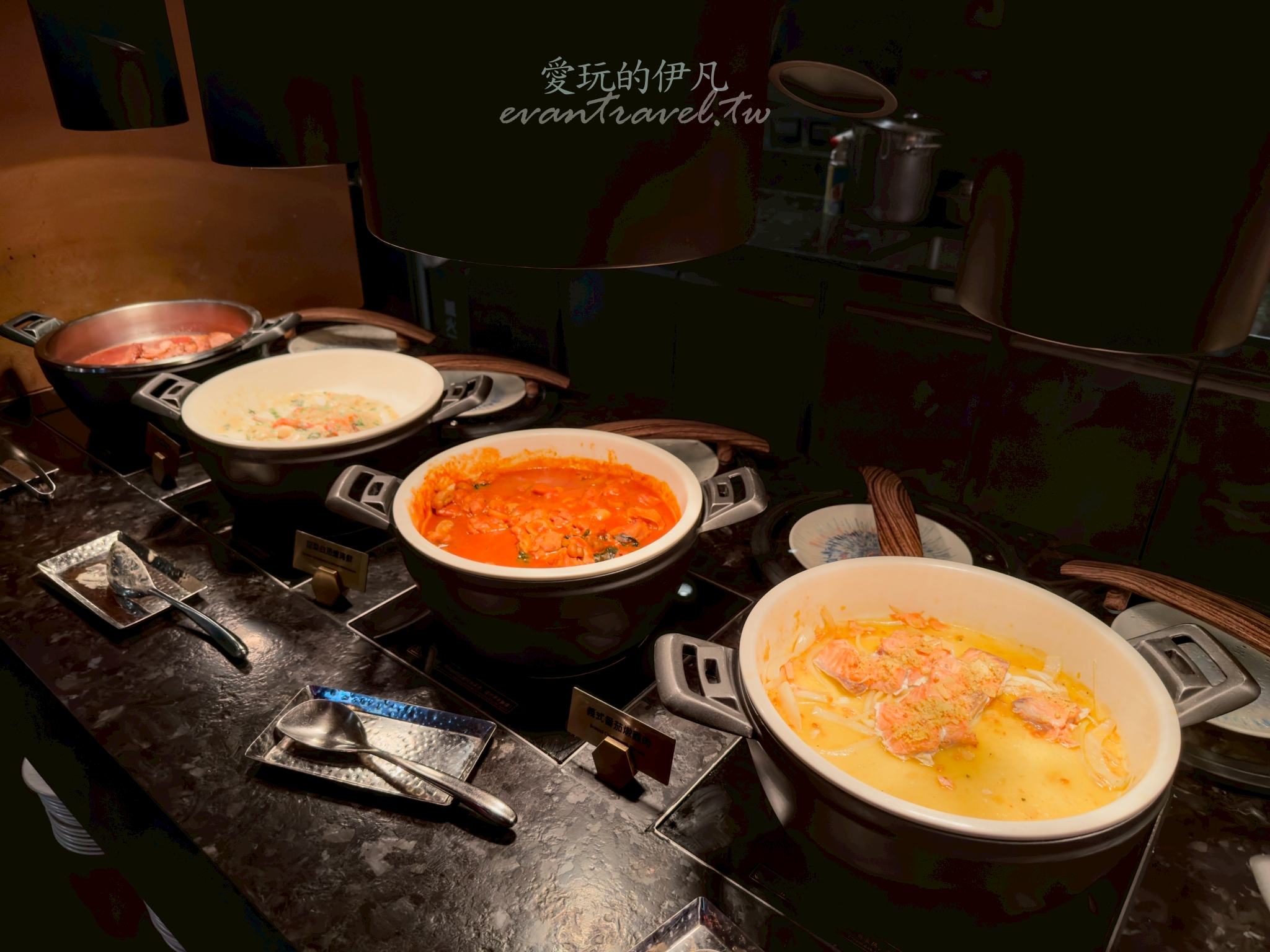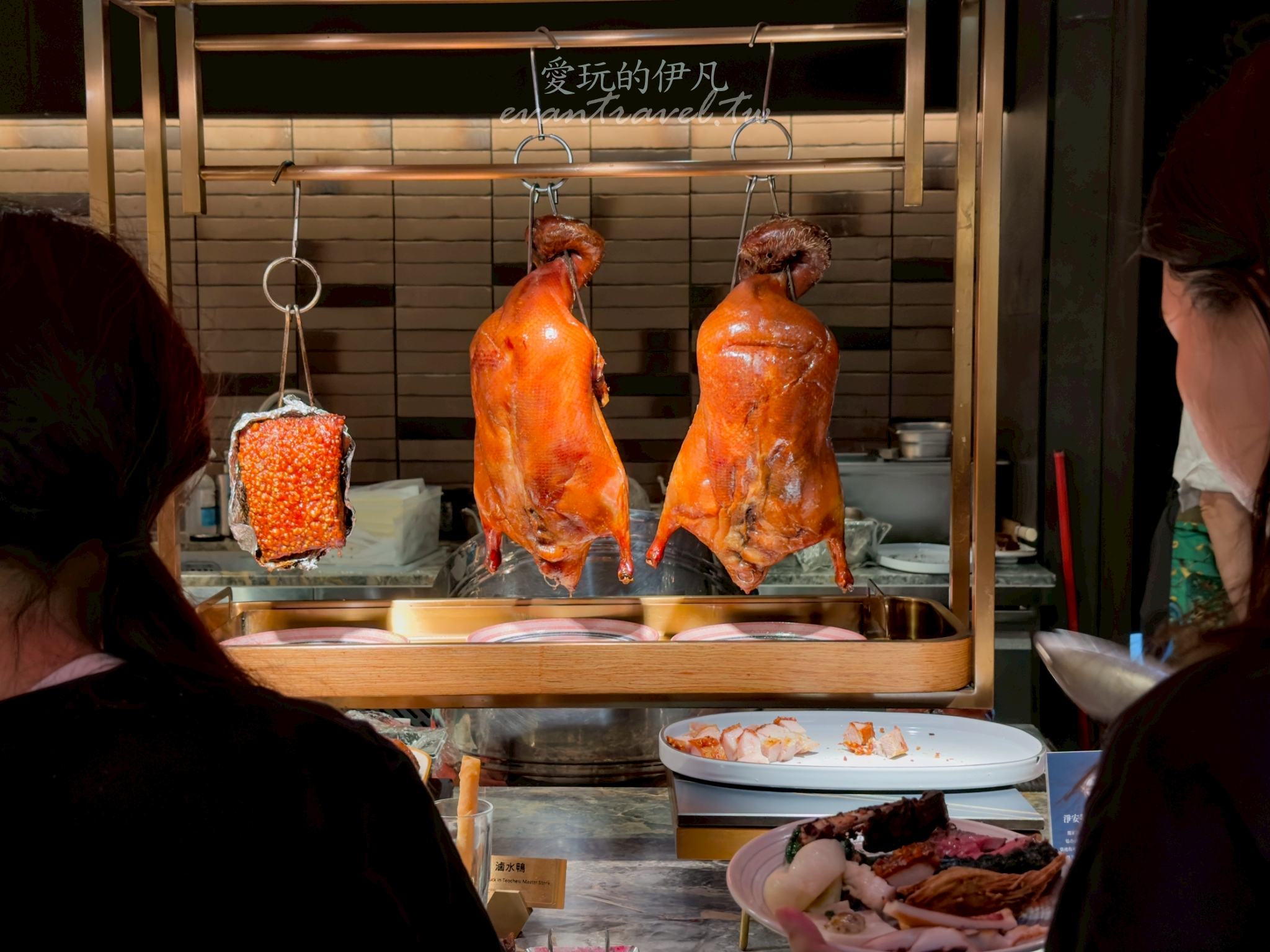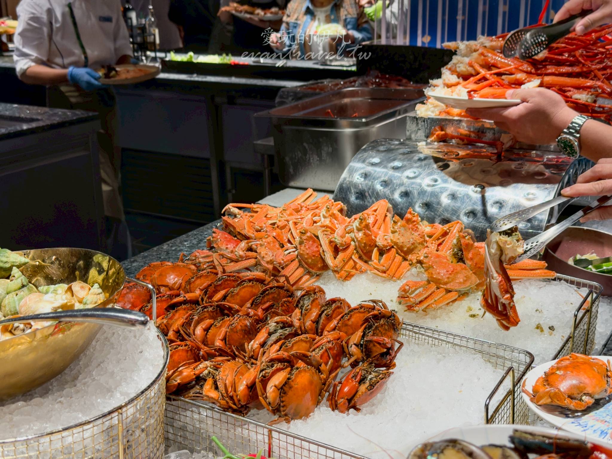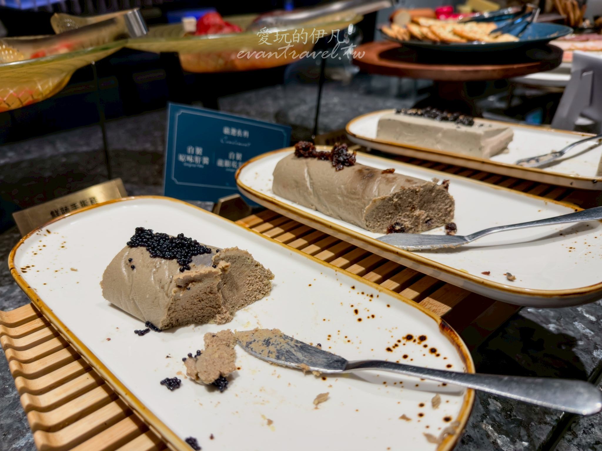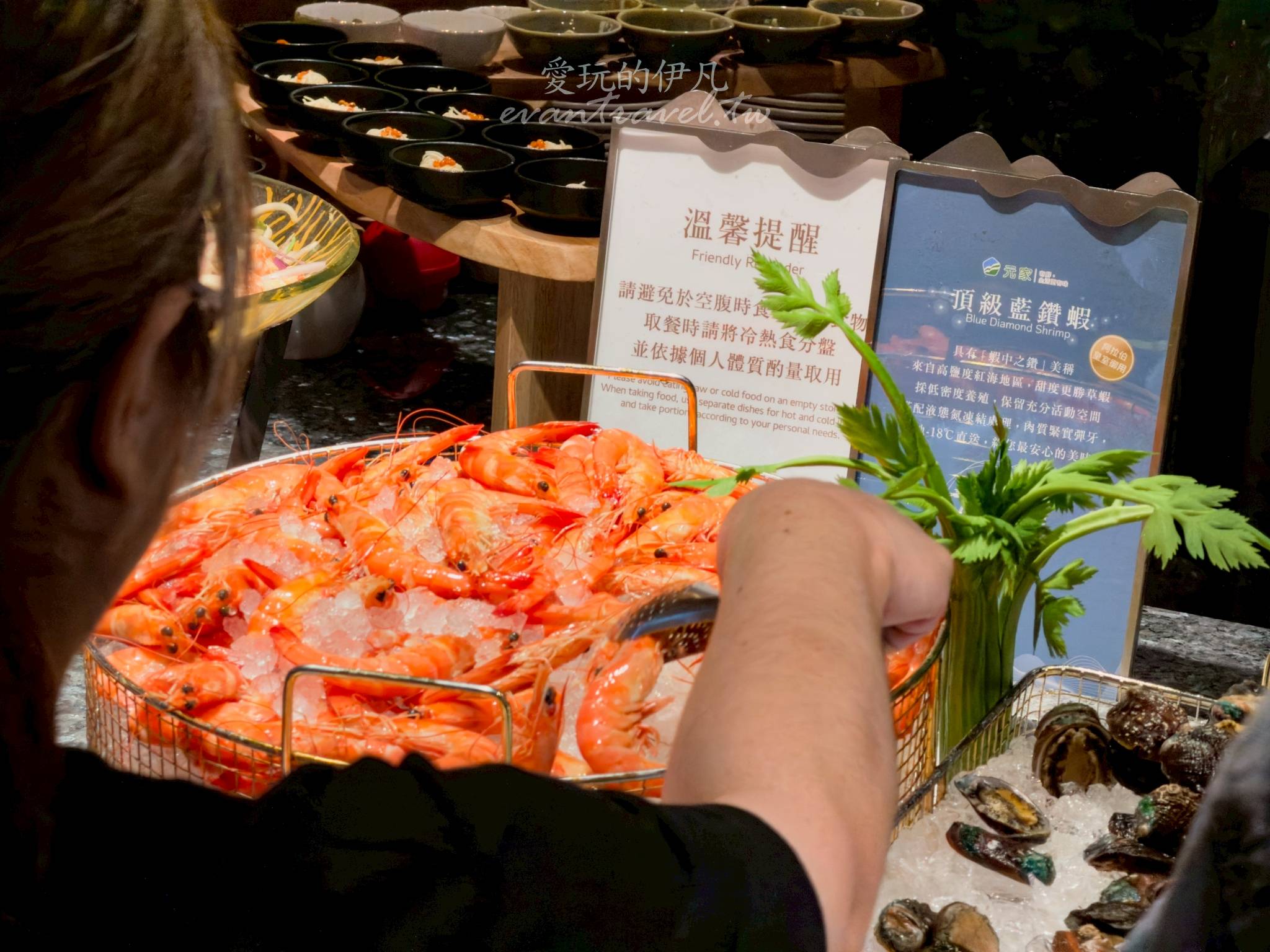 海鮮控的第一站一定是這裡。海鮮冰檯擺滿白蝦、雪場蟹腳、當季螃蟹,還出現一般 buffet 很少看到的法國海螺。冰鎮過後的鮮甜感非常明顯。旁邊還有鮮蔬沙拉區,提供在地小農生菜、產銷履歷水果,加上一整支現切帕瑪火腿、松露肝醬、波特葡萄肝醬,搭配冰白酒或氣泡飲開胃效果極佳。