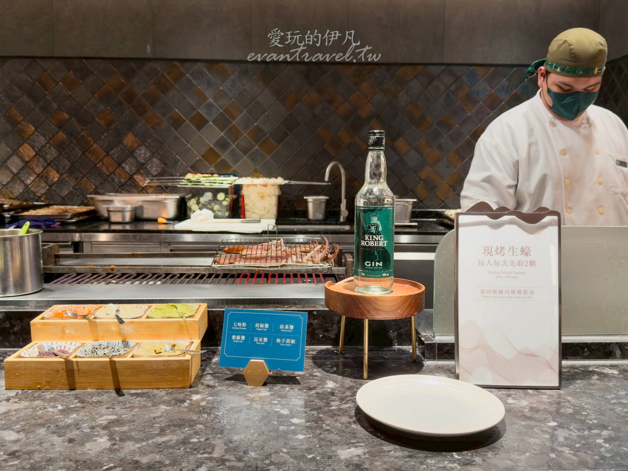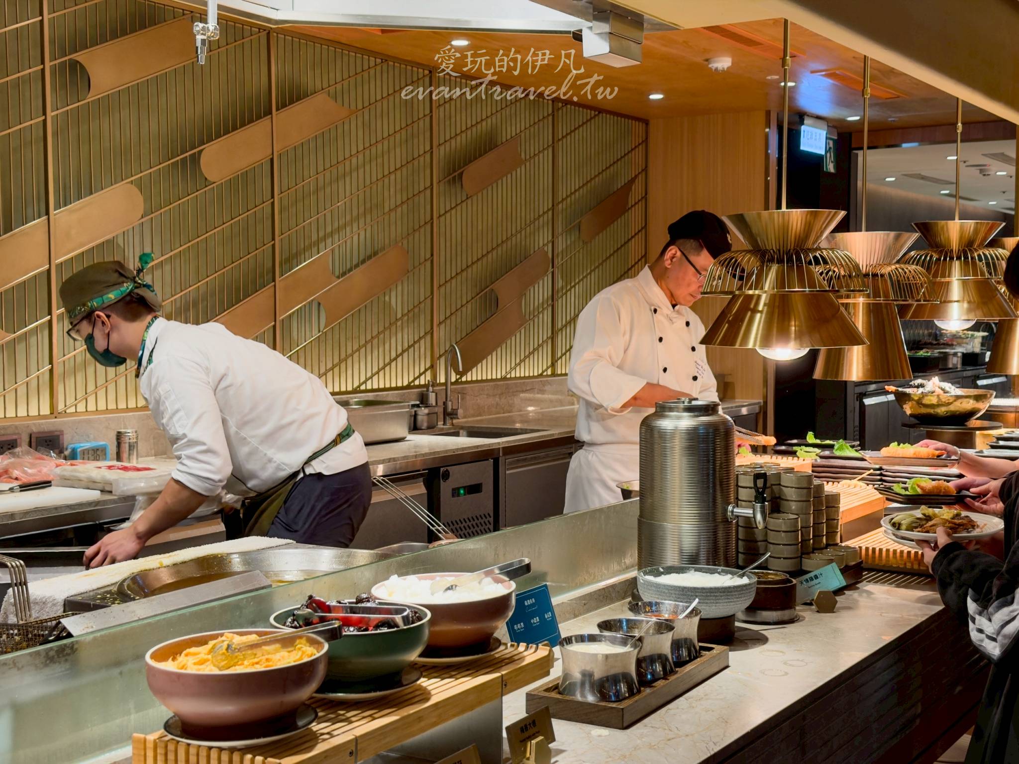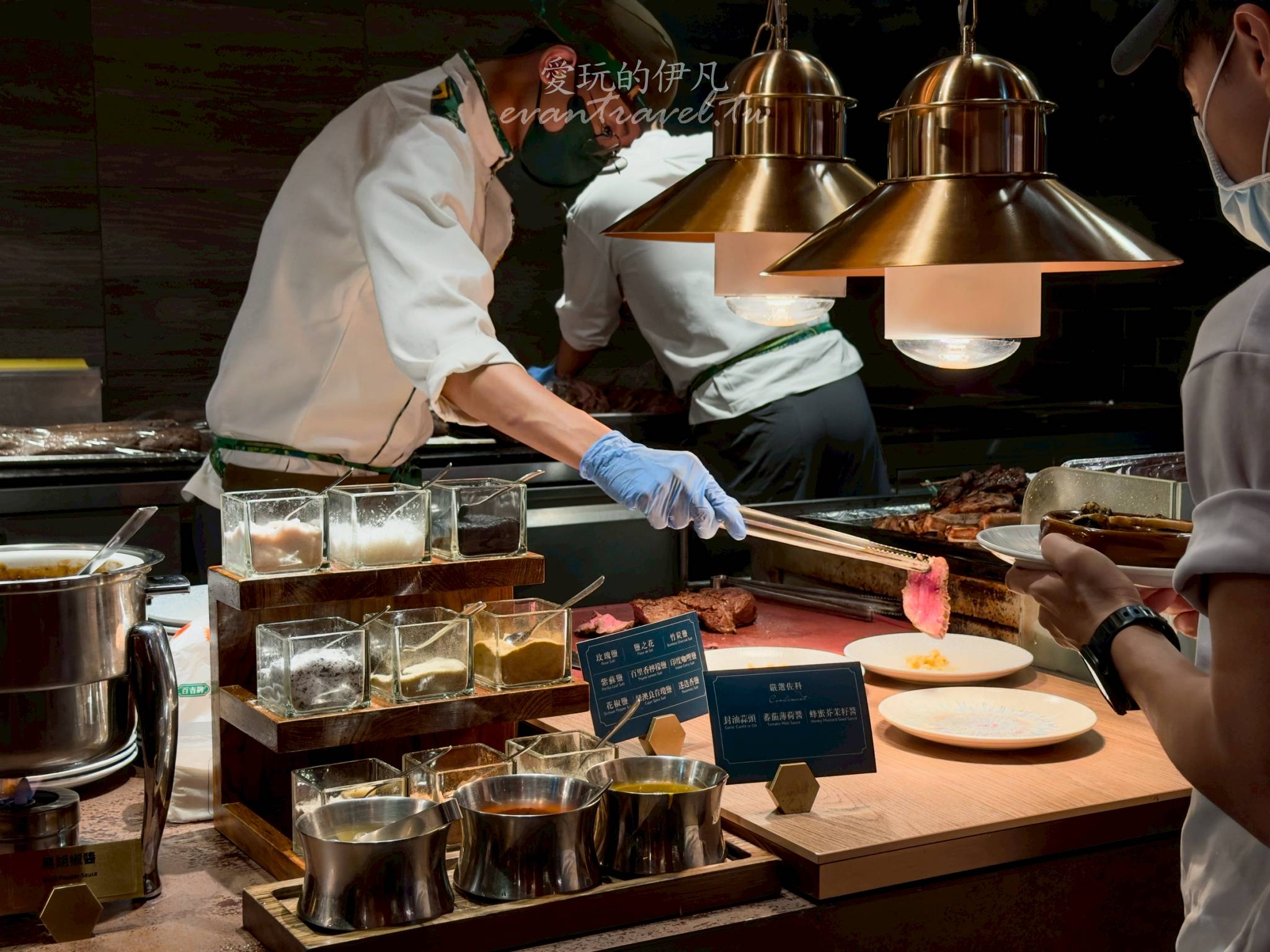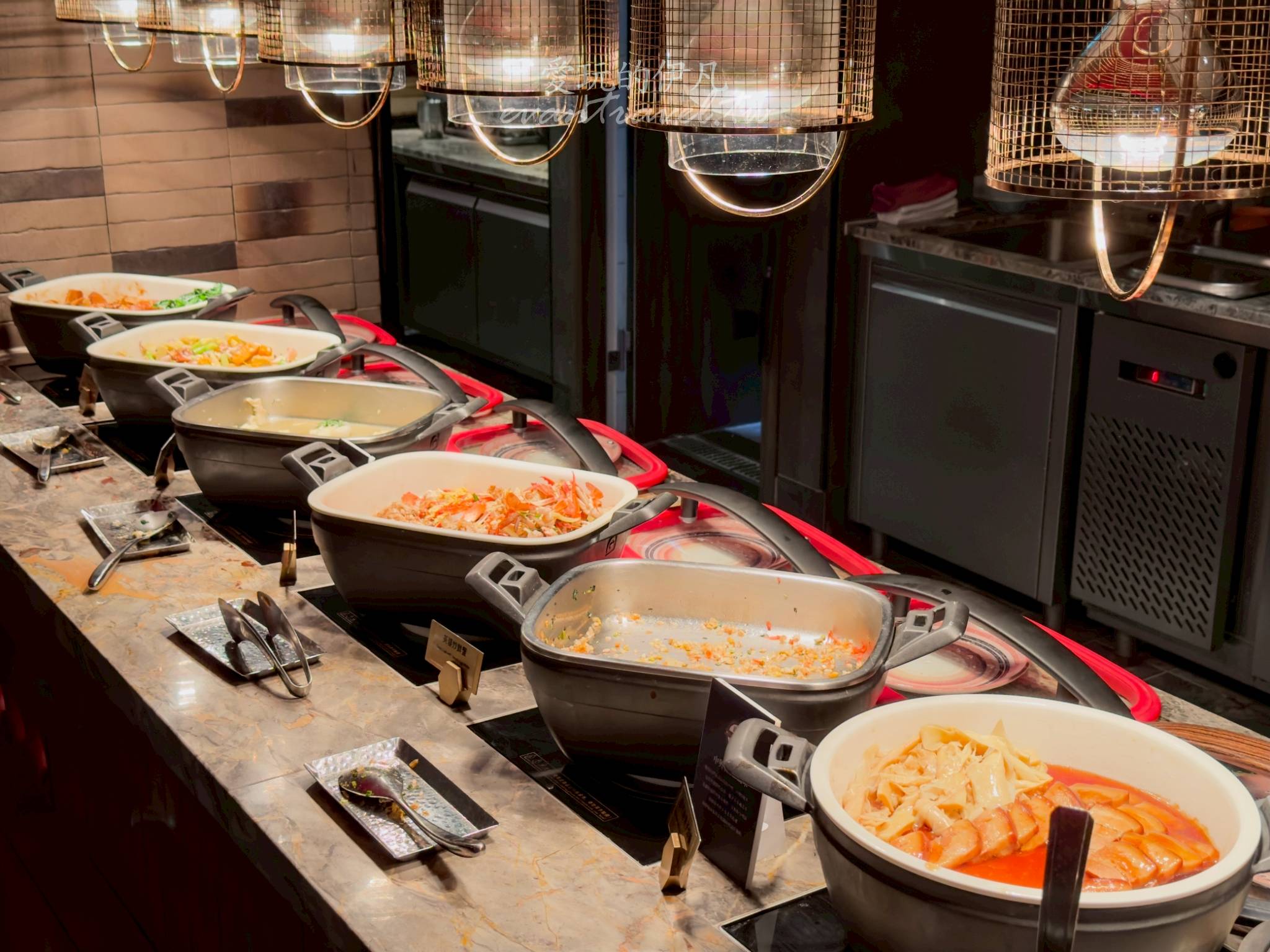 海鮮控的第一站一定是這裡。海鮮冰檯擺滿白蝦、雪場蟹腳、當季螃蟹,還出現一般 buffet 很少看到的法國海螺。冰鎮過後的鮮甜感非常明顯。旁邊還有鮮蔬沙拉區,提供在地小農生菜、產銷履歷水果,加上一整支現切帕瑪火腿、松露肝醬、波特葡萄肝醬,搭配冰白酒或氣泡飲開胃效果極佳。
