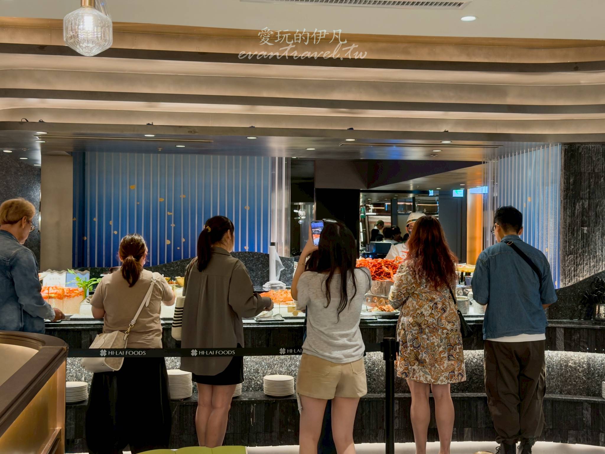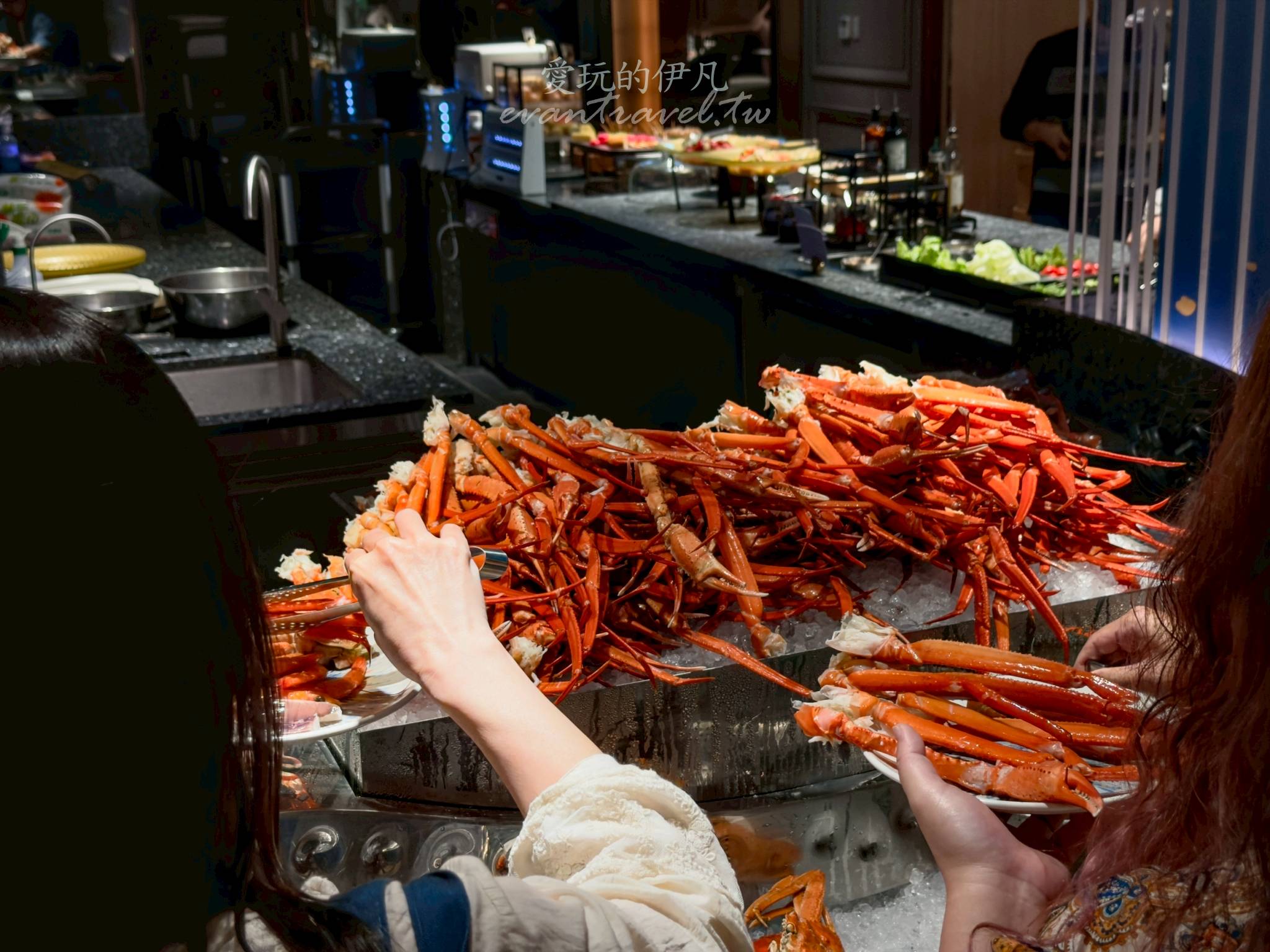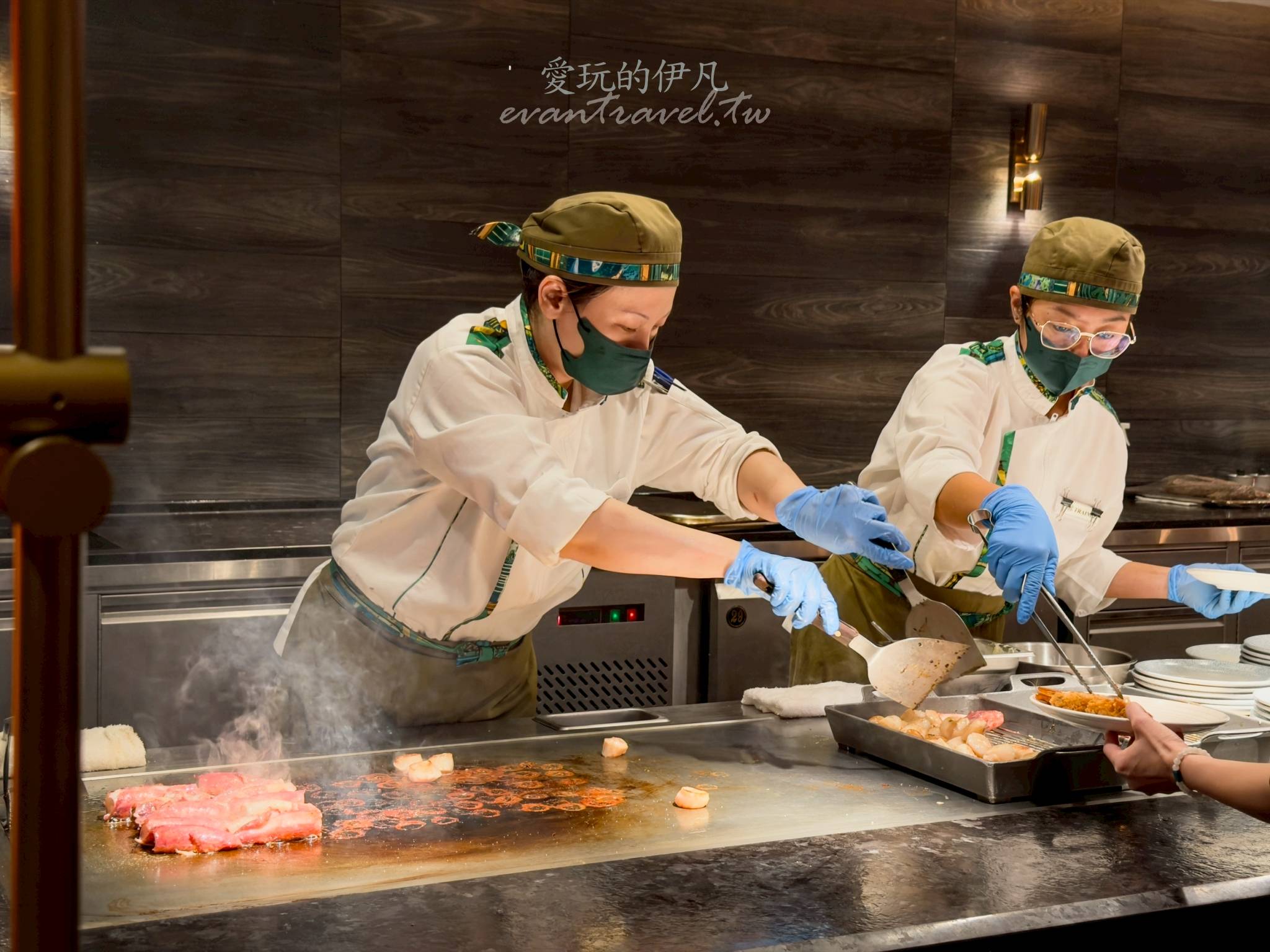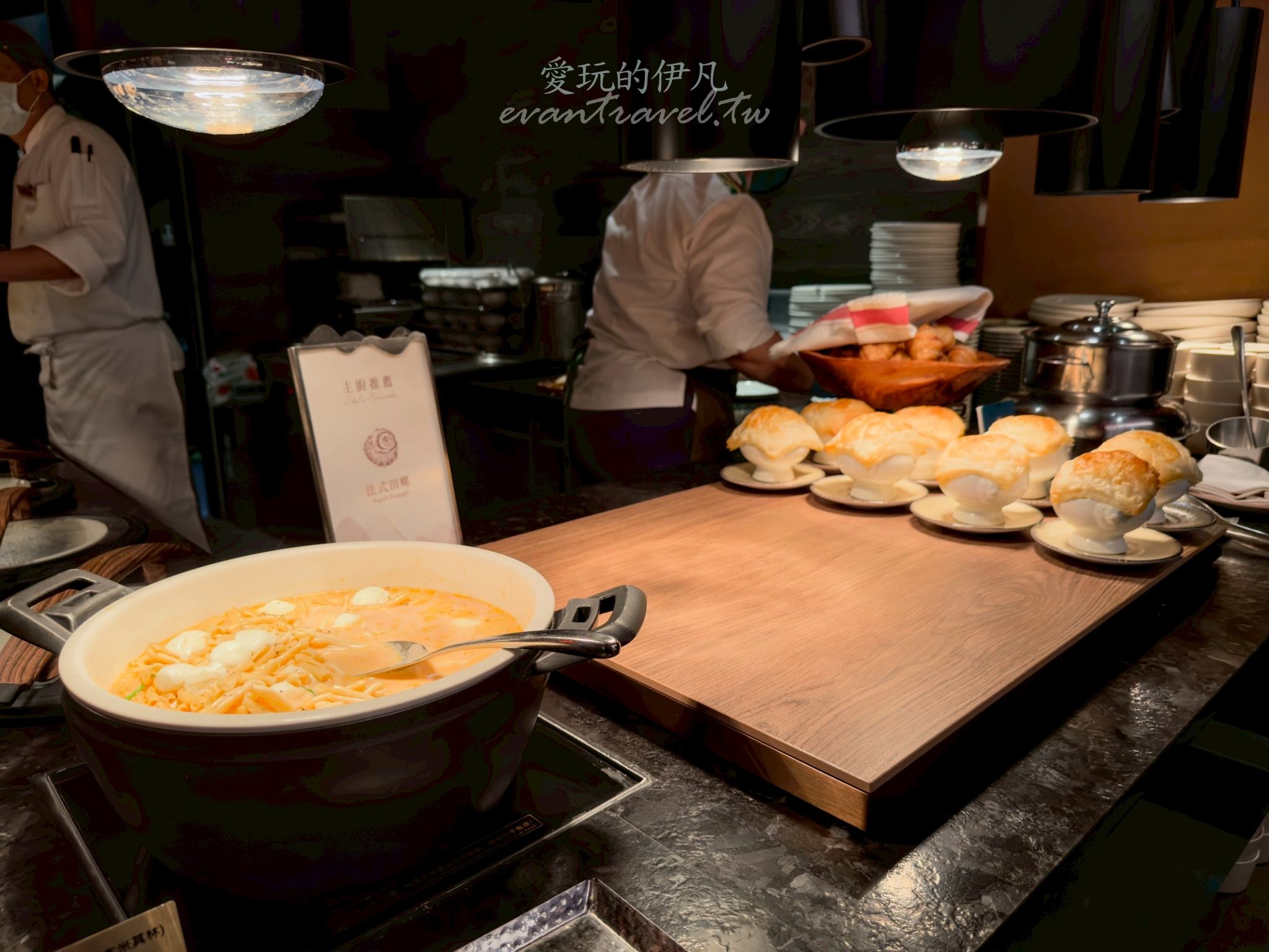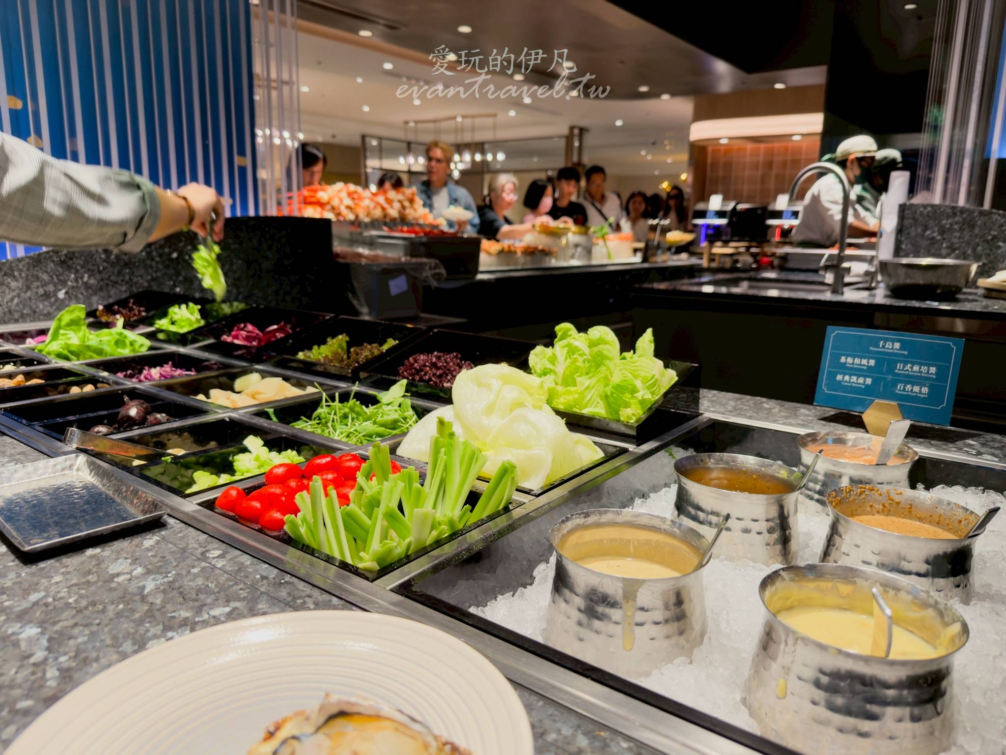 海鮮控的第一站一定是這裡。海鮮冰檯擺滿白蝦、雪場蟹腳、當季螃蟹,還出現一般 buffet 很少看到的法國海螺。冰鎮過後的鮮甜感非常明顯。旁邊還有鮮蔬沙拉區,提供在地小農生菜、產銷履歷水果,加上一整支現切帕瑪火腿、松露肝醬、波特葡萄肝醬,搭配冰白酒或氣泡飲開胃效果極佳。