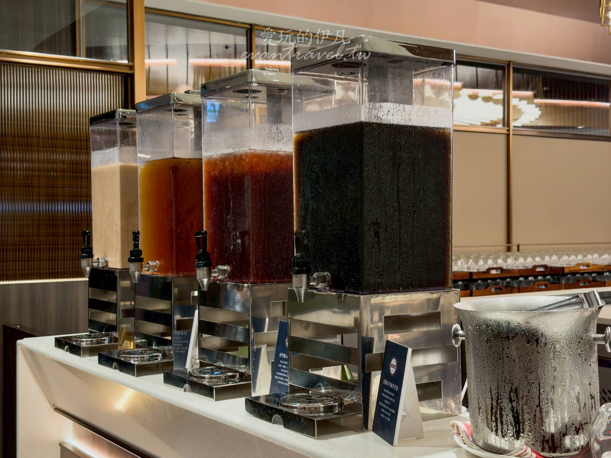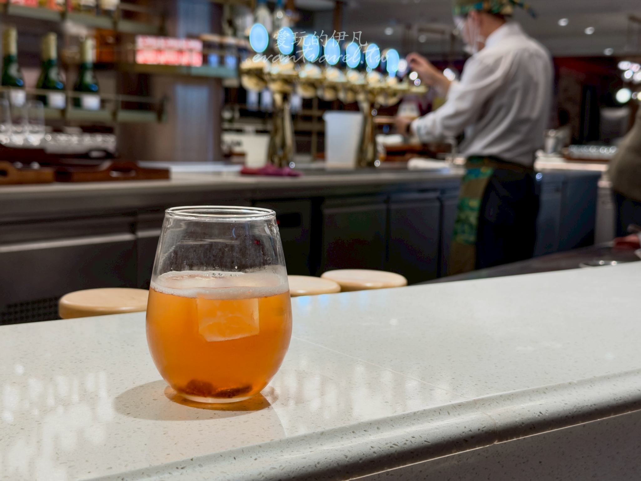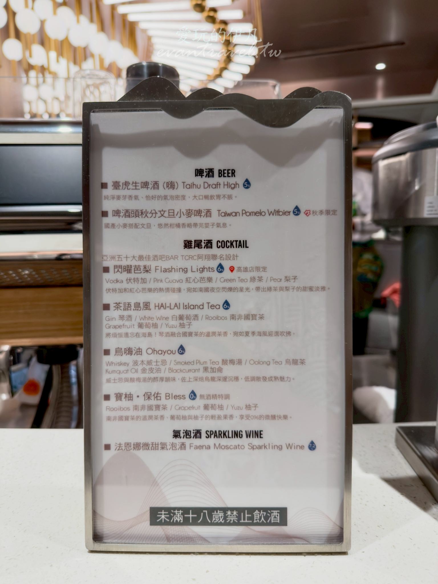 飲品區比想像中華麗,是半圓形吧檯,專門提供咖啡、茶品、冬瓜茶、黑糖飲、果汁,甚至有台虎啤酒。這次高雄店還推出限定調酒「閃耀芭梨」,味道清爽帶果香,很夏天也很南部。跟大苑子聯名的「不紫葡萄芭樂」果汁也很好喝。