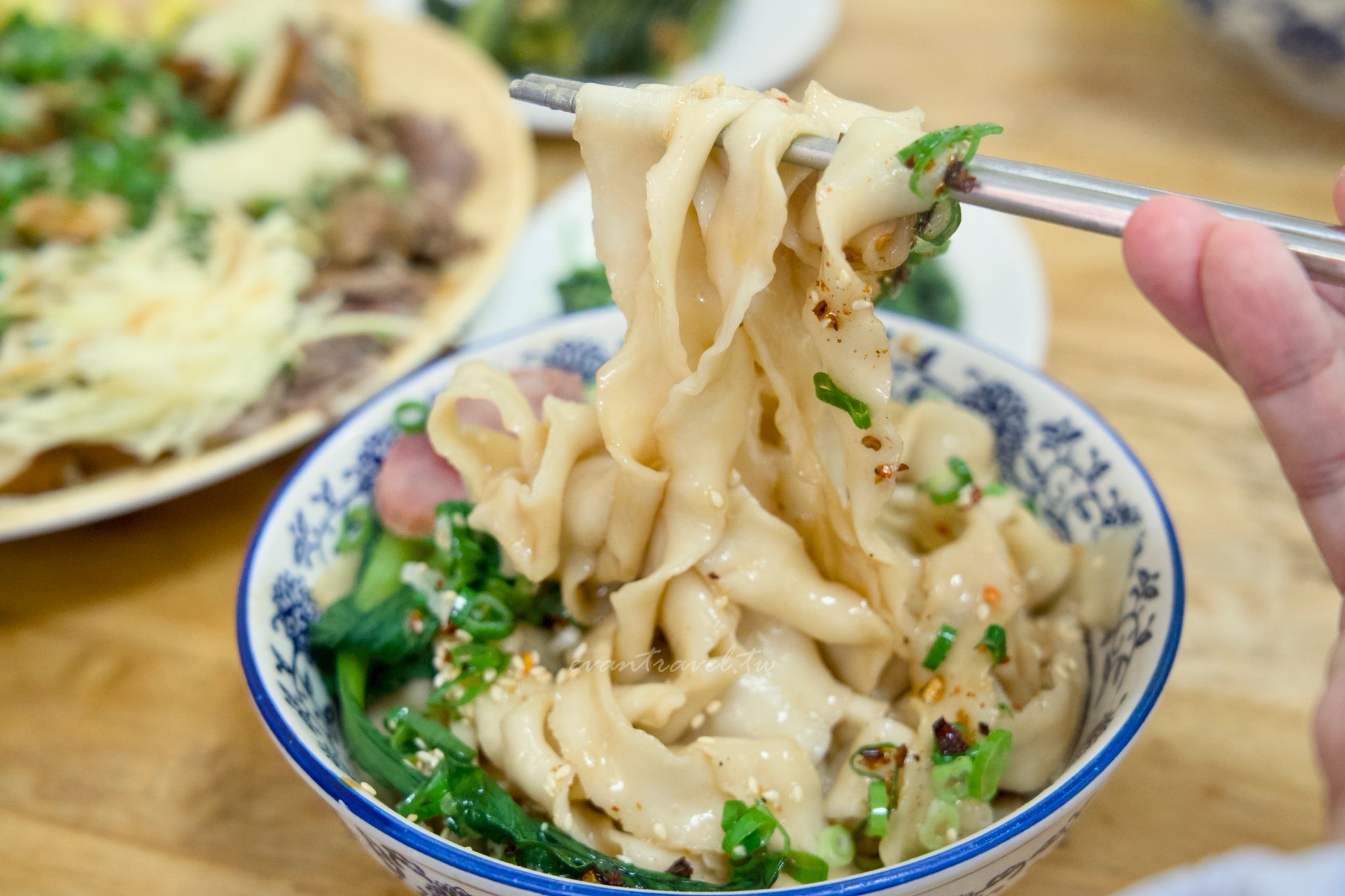 這就是傳說中的「潑辣麵」!使用的是寬版的波浪麵條,口感非常有嚼勁(Q彈)。 最精華的步驟是老闆會將特製的辣粉、蔥花撒在麵上,最後淋上一勺滾燙的熱*。「滋~」的一聲,瞬間激發出辣椒與辛香料的香氣,那股鑊氣真的是無可取代。