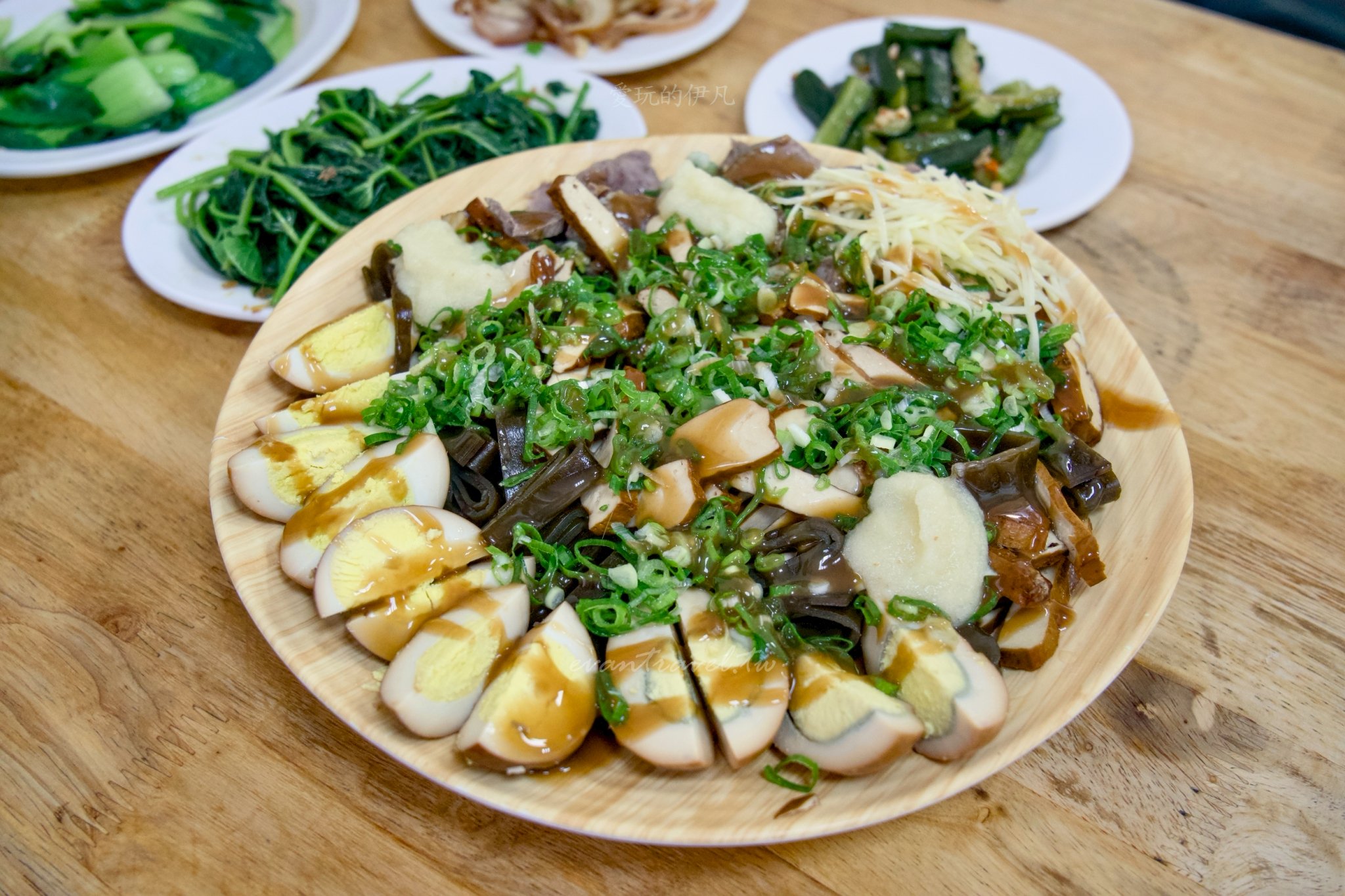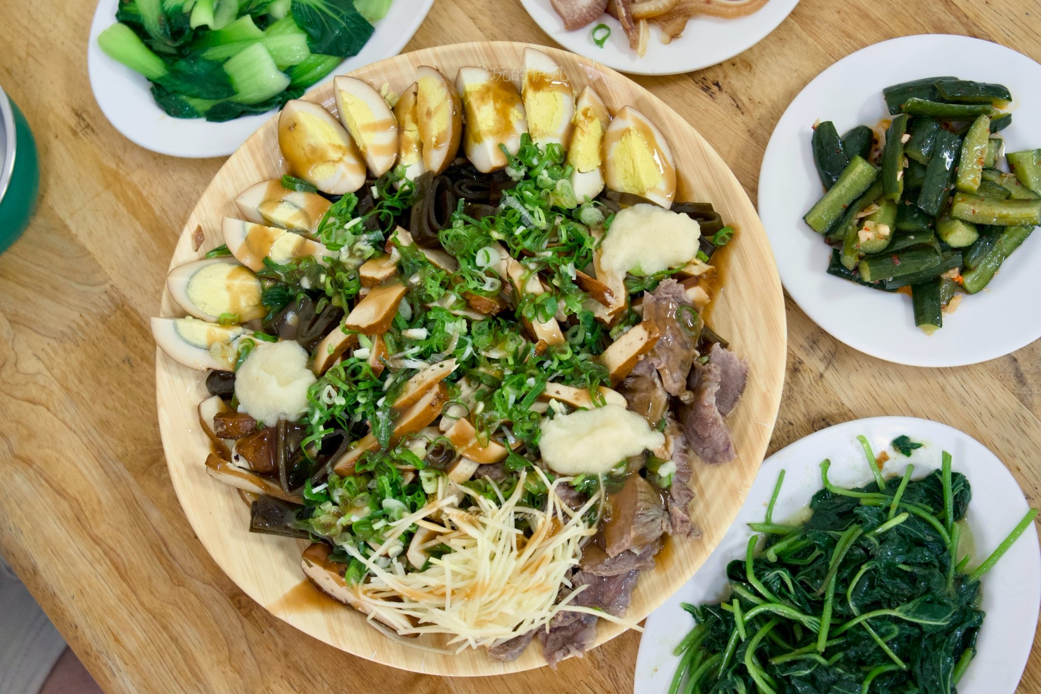 來無名麵店,滷味切一大盤是標配! 我們這次點了滷蛋、海帶、豆干、豬肉片。老闆切工細緻,最棒的是上面會給超級豪邁的**「蒜泥」「蔥花」**,搭配特製的醬油膏,鹹甜蒜香交織,真的超級涮嘴!