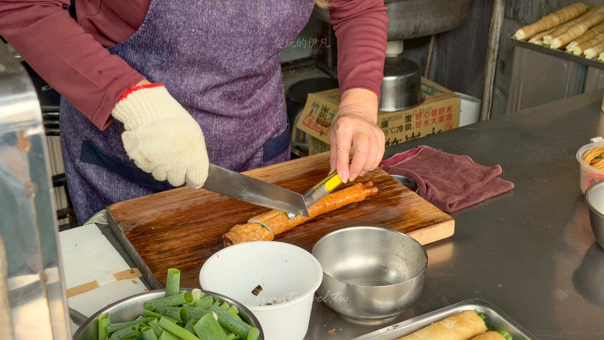 走到攤位前,很難不被那一盤盤排列整齊、塞得飽滿紮實的生肥腸吸引。老闆娘堅持手工將新鮮大腸頭清洗乾淨後,塞入一整根翠綠的青蔥。看著她在油鍋前專注的神情,俐落地將炸得金黃酥脆的肥腸切段,發出「卡滋卡滋」的誘人聲響,光是用聽的就讓人食慾大開。