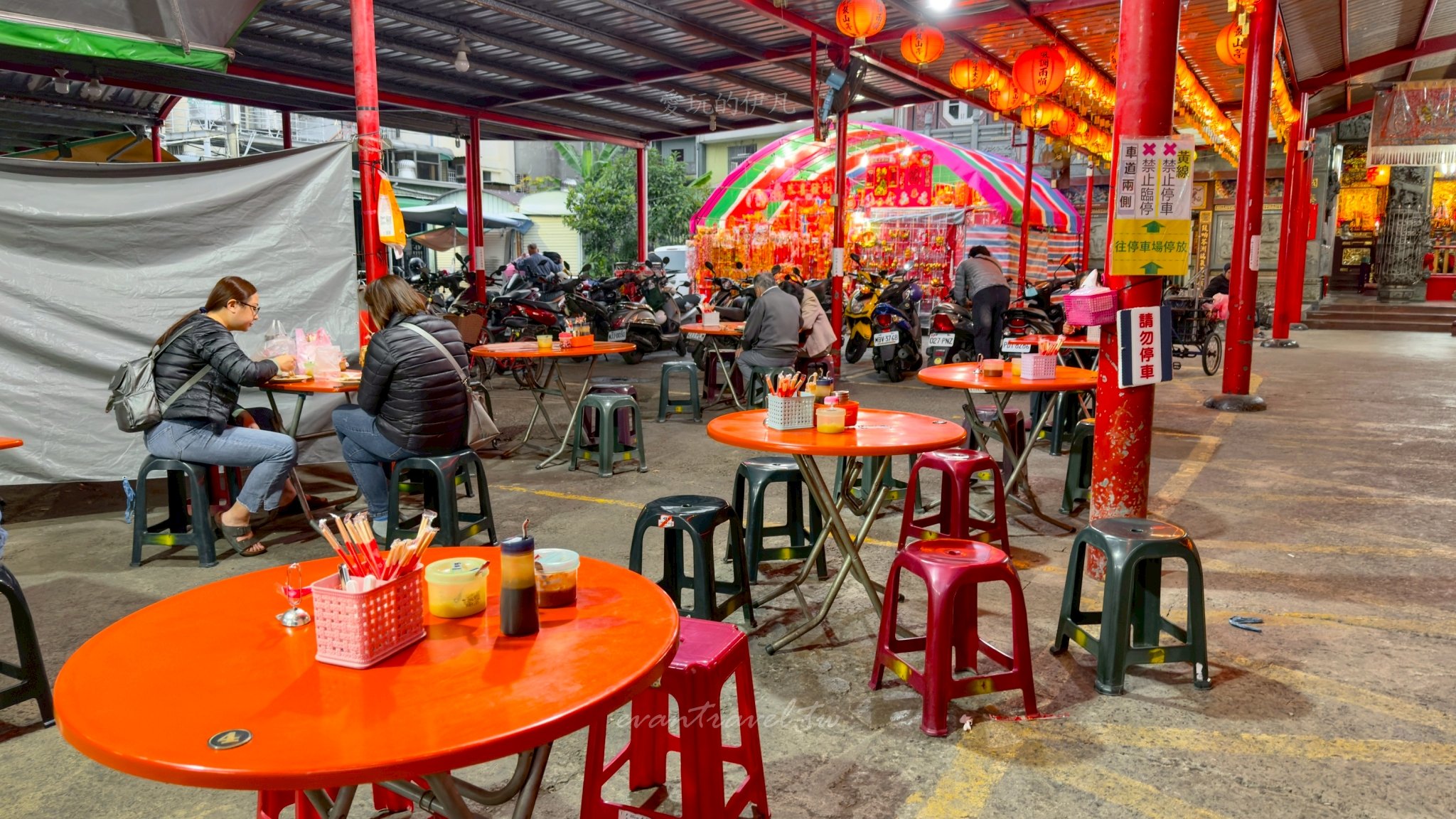 這家店的位置極具辨識度,就坐落在苓雅市場內興中路附近的廟宇前。用餐區充滿了南台灣特有的豪邁感,一排排紅色的圓桌與塑膠凳子就在廟埕棚架下展開,抬頭還能看見整排亮紅的報喜燈籠,這種「廟口開飯」的沉浸式體驗,是在精緻百貨餐廳裡永遠找不到的生活感。