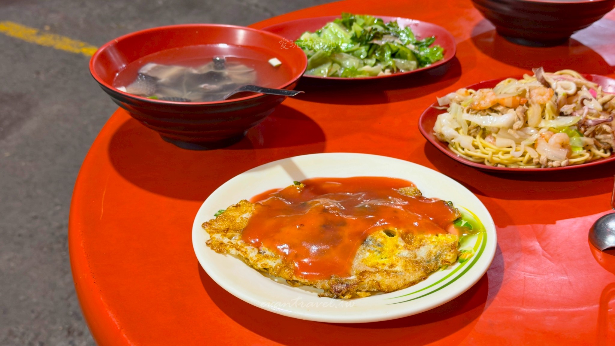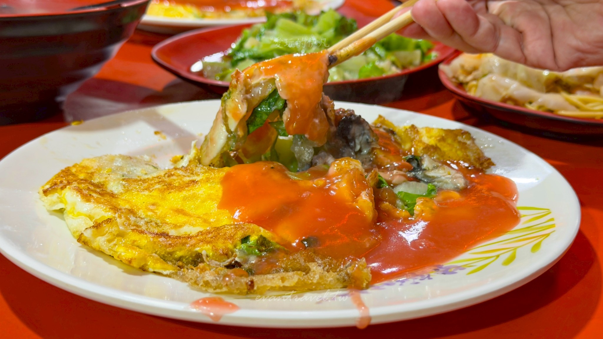 厚實的蛋香包覆著飽滿多汁的鮮蚵與清脆白菜,最後淋上店家特製的鮮紅甜辣醬,鹹甜交織的風味完美襯托出蚵仔的鮮度。
