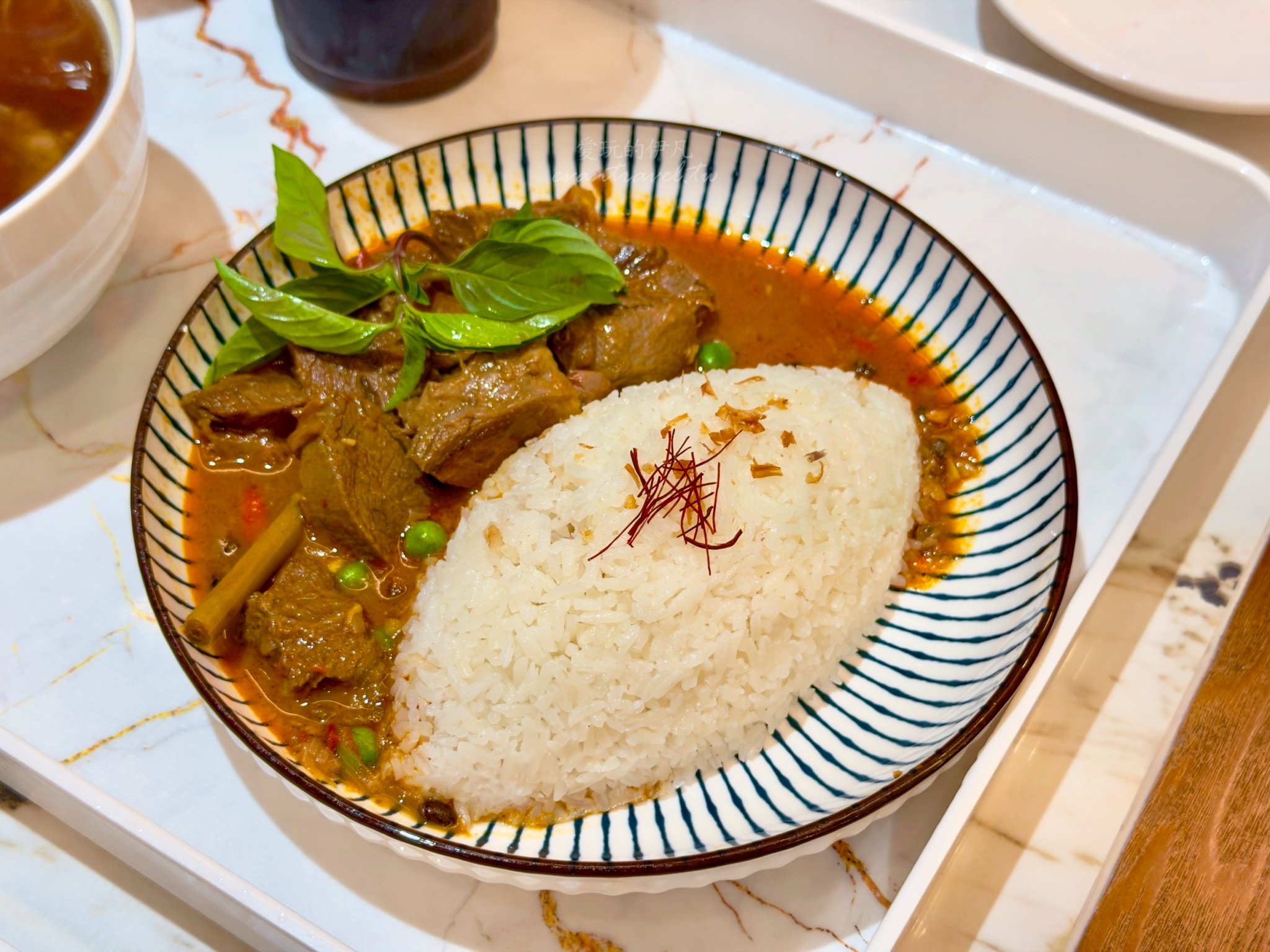 榮獲 CNN 全球美食冠軍頭銜的招牌菜。深褐色的牛肉塊燉煮得極為入味,外層裹滿了濃縮的香料醬汁(Rendang)。入口時,先是感受到椰奶的溫潤與焦糖化的甜香,緊接著是南薑、香茅與辣椒交織出的微辣辛香在舌尖爆發。牛肉選用帶筋部位,經過長時間慢燉後,口感軟嫩卻不失嚼勁,搭配粒粒分明的香米飯,濃郁的醬汁更是白飯殺手,讓人忍不住一口接一口。