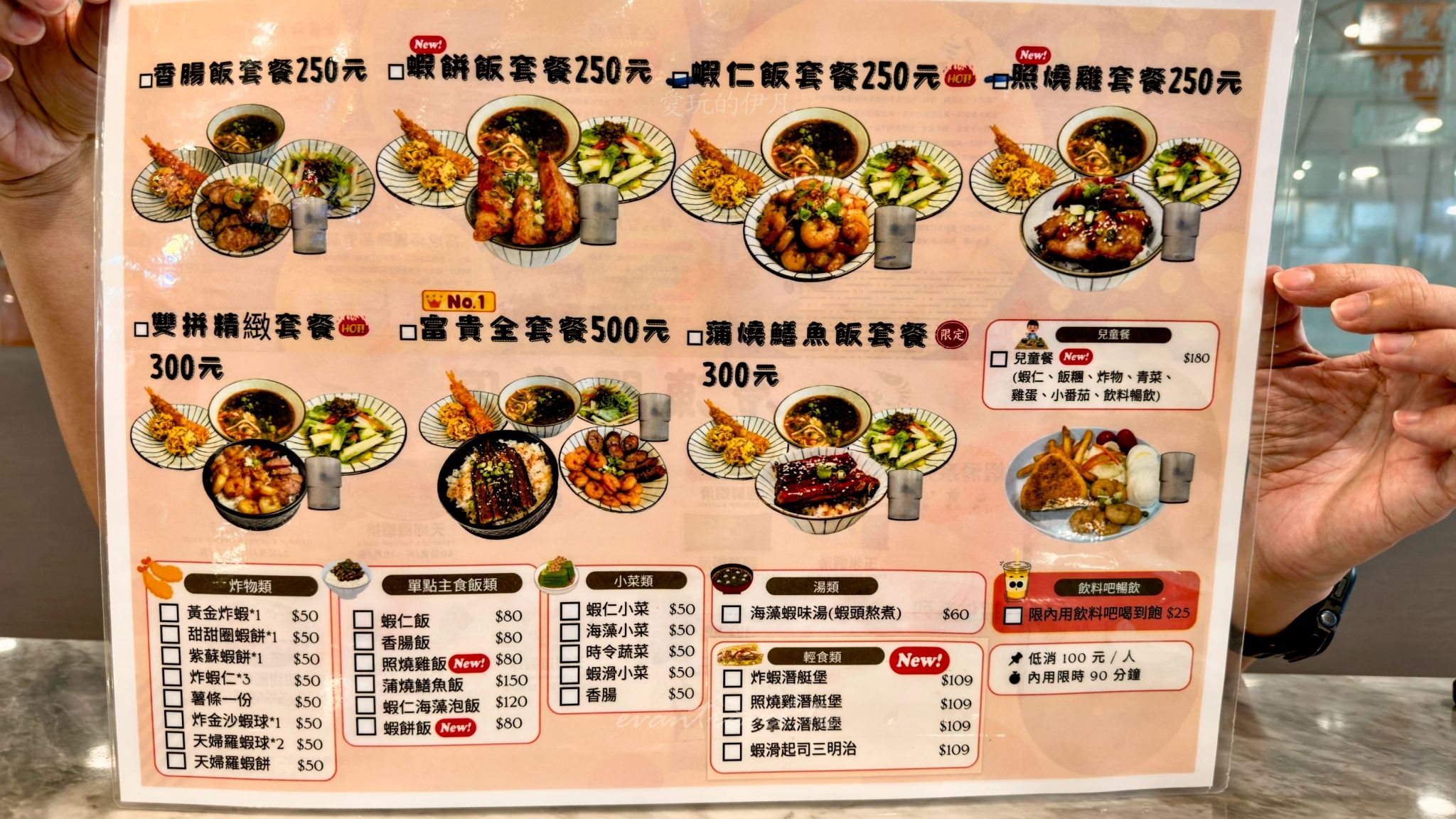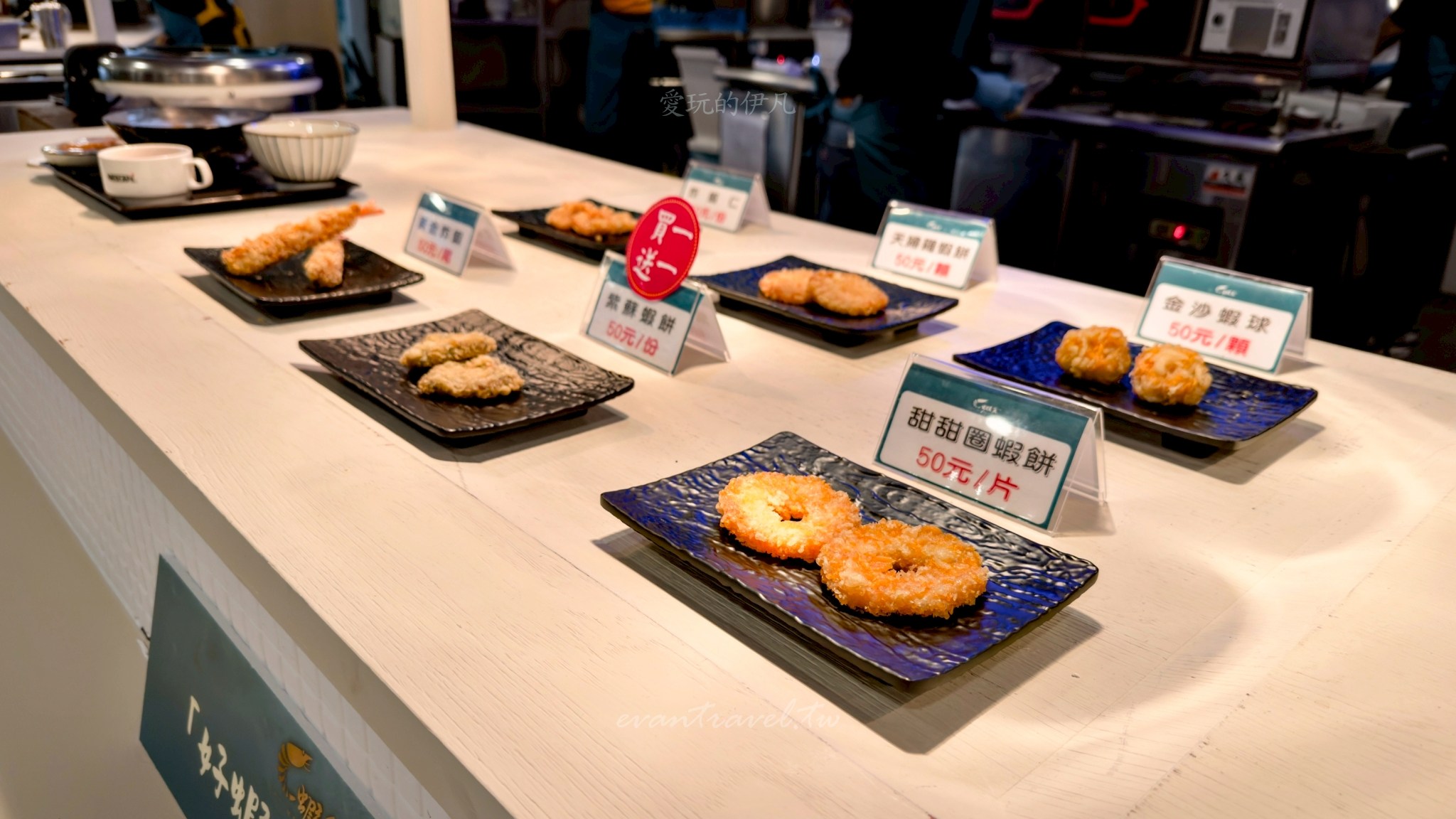 半開放式櫃台與炸物展示 餐廳採用半開放式的櫃台設計,看起來乾淨明亮。櫃台前還展示了許多炸物模型(像是金沙蝦球、甜甜圈蝦餅等),光看模型就讓人很想加點!