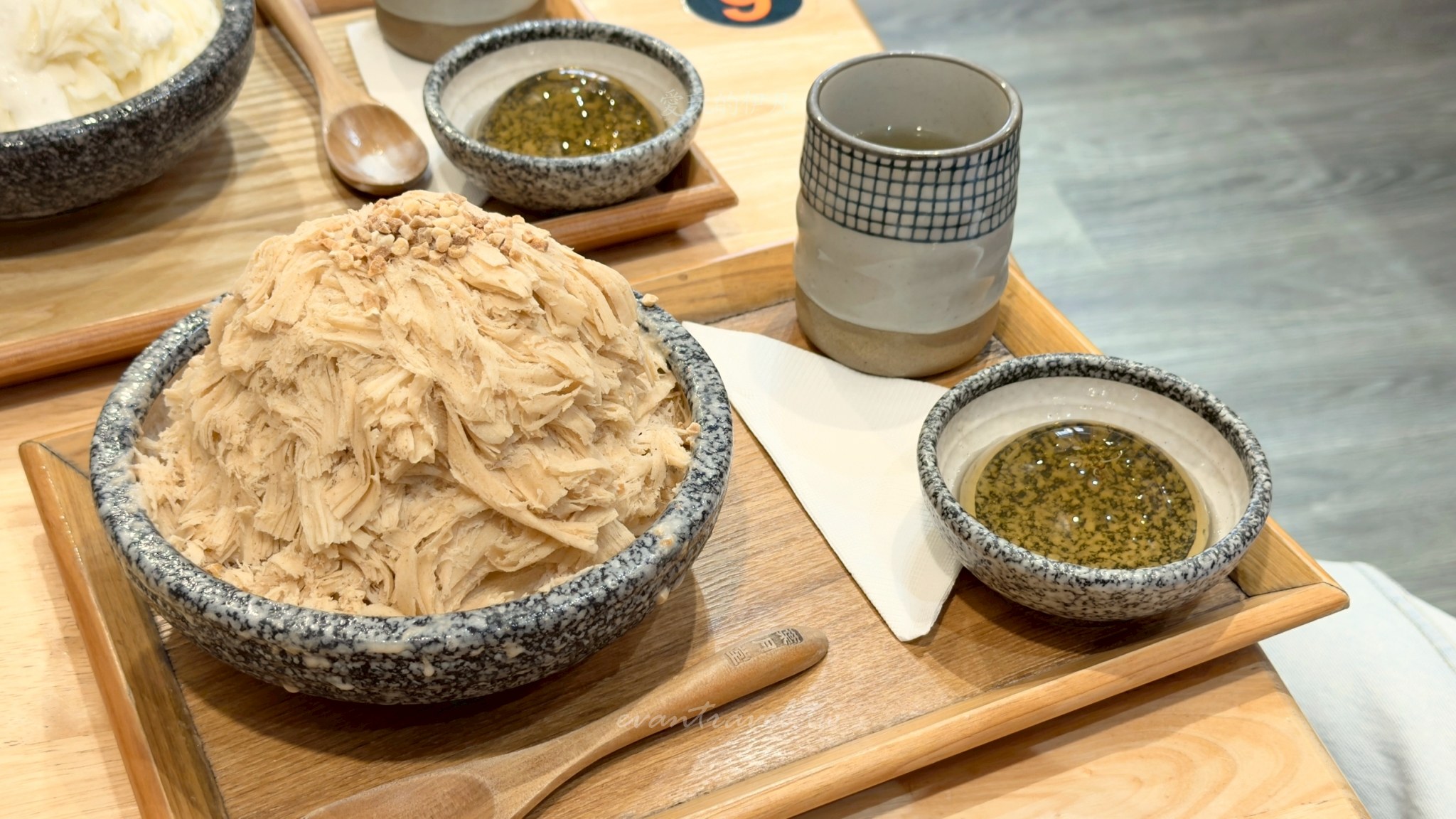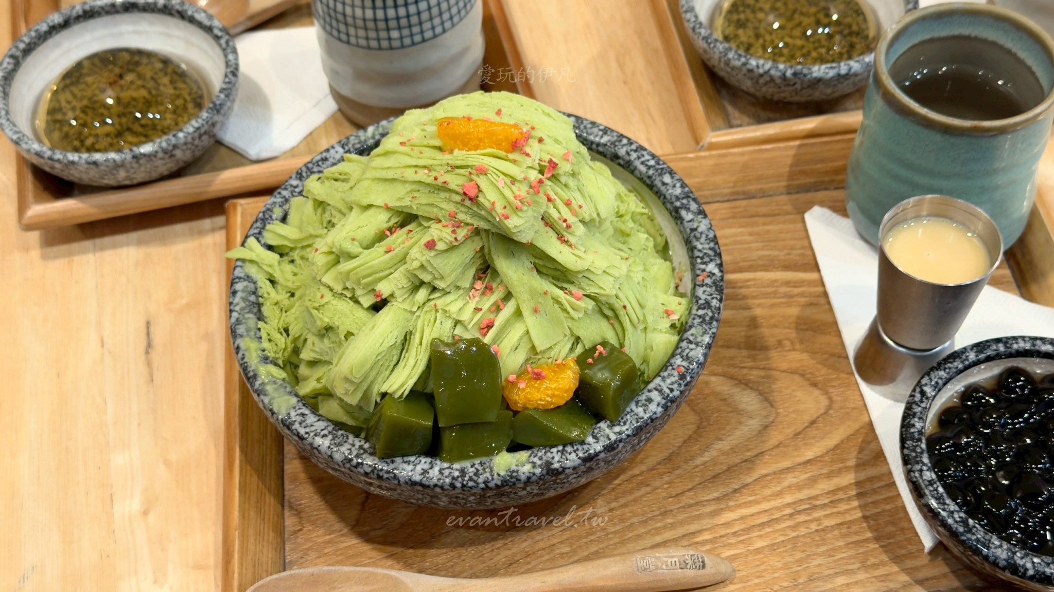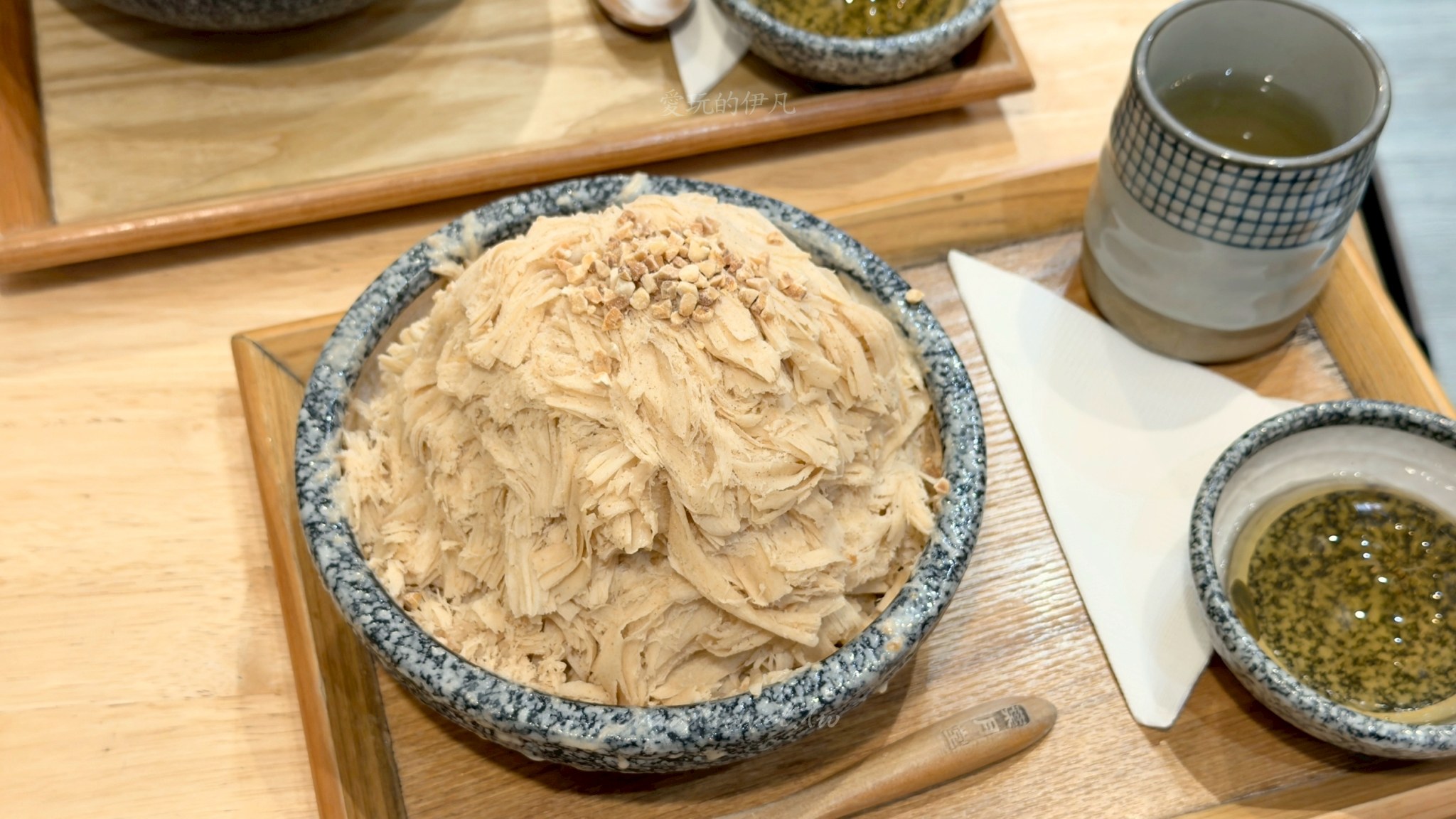 這次我們一行三個大人來訪,點了三款截然不同風格的雪花冰,分別是「榴心花園」「海鹽花生」以及「宇治金時」。葉月堂最棒的一點是,每份冰品都可以免費選擇一樣配料(珍珠、白玉或蜂蜜桂花凍),而且隨餐都會附上一杯熱呼呼的「牛蒡茶」,這杯茶真的是神來之筆,吃完幾口冰後喝一口熱茶,不僅能暖胃,還能瞬間消除口中的甜膩感,讓味蕾重新歸零。