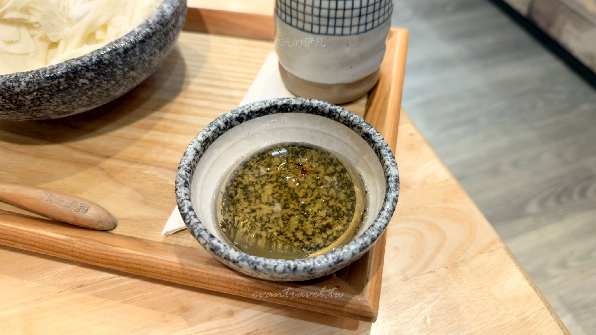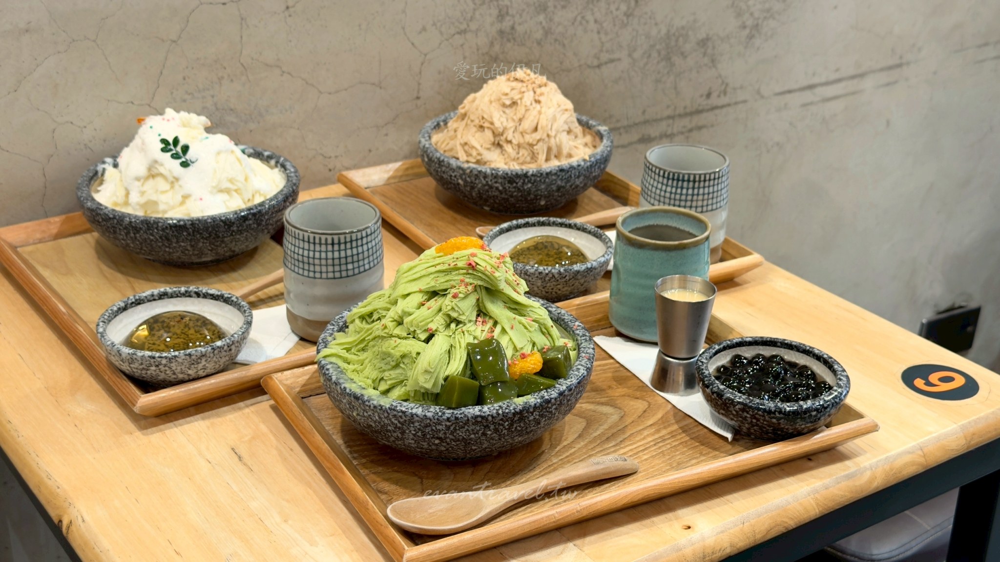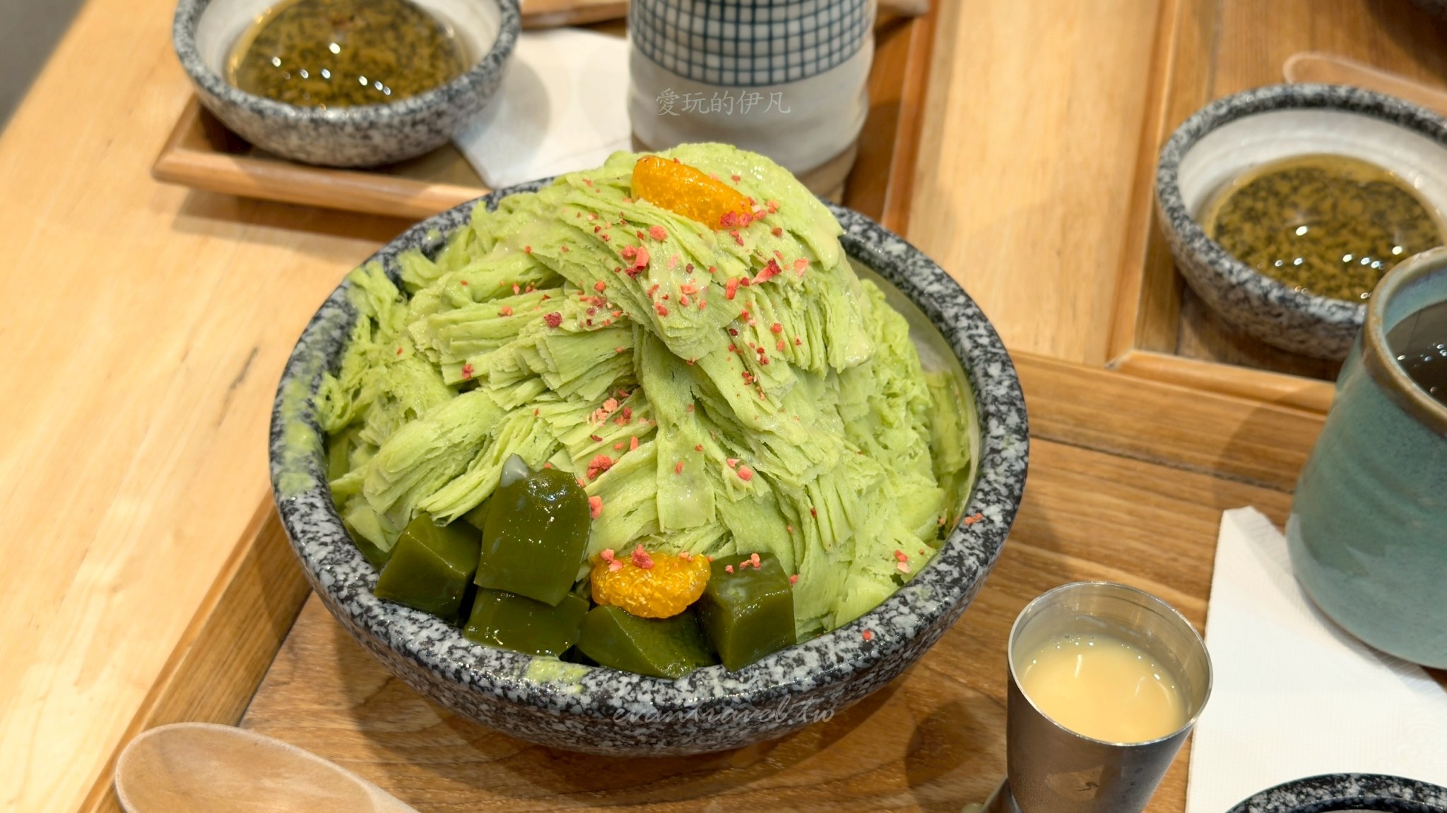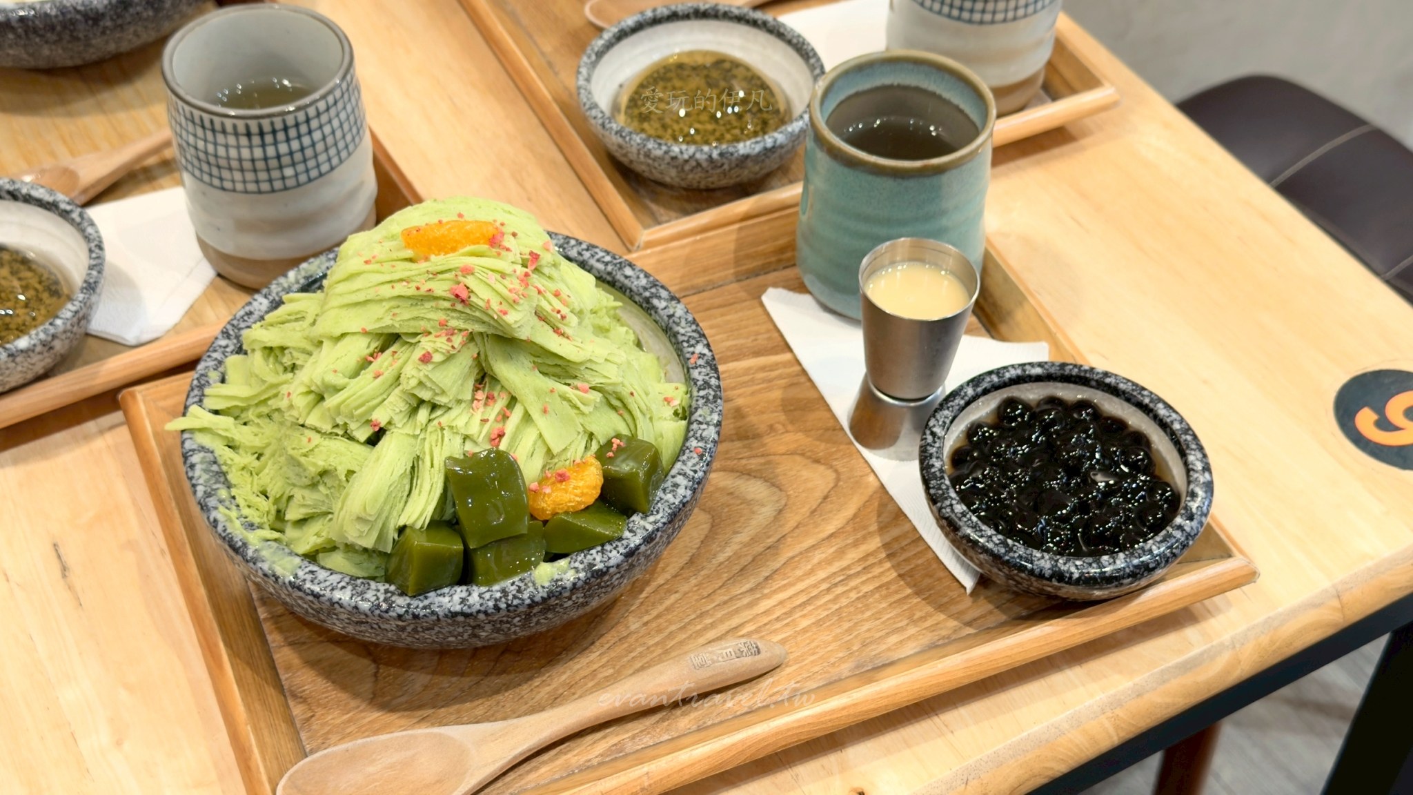 這次我們一行三個大人來訪,點了三款截然不同風格的雪花冰,分別是「榴心花園」「海鹽花生」以及「宇治金時」。葉月堂最棒的一點是,每份冰品都可以免費選擇一樣配料(珍珠、白玉或蜂蜜桂花凍),而且隨餐都會附上一杯熱呼呼的「牛蒡茶」,這杯茶真的是神來之筆,吃完幾口冰後喝一口熱茶,不僅能暖胃,還能瞬間消除口中的甜膩感,讓味蕾重新歸零。