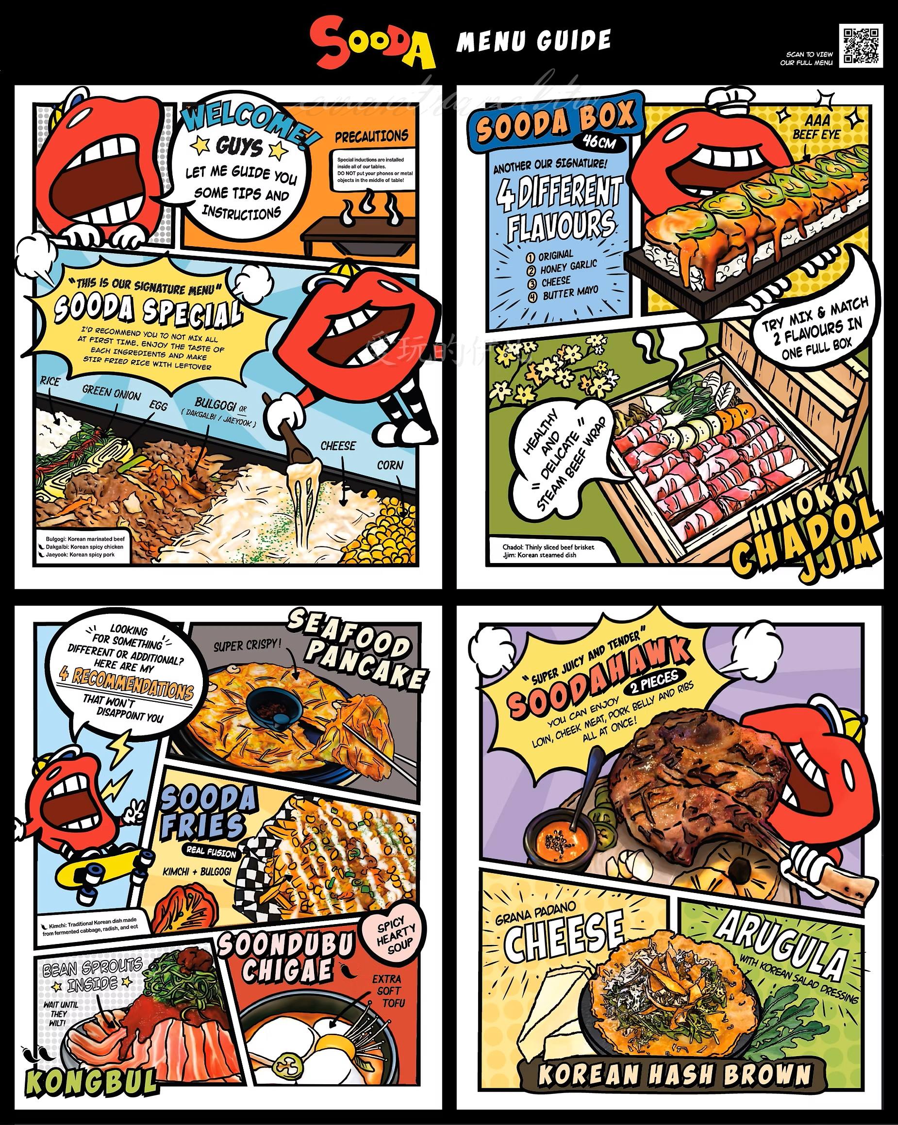 人氣招牌包括 Sooda Box(火炙韓式生牛肉長壽捲)、融合起司煎盤(Sooda Bulgogi Hot Plate)、與各式炸雞與熱鍋料理。評論多讚賞其多元小食組合與創意呈現方式,即使食材種類多,主視覺依舊保持精緻與 IG 友善。