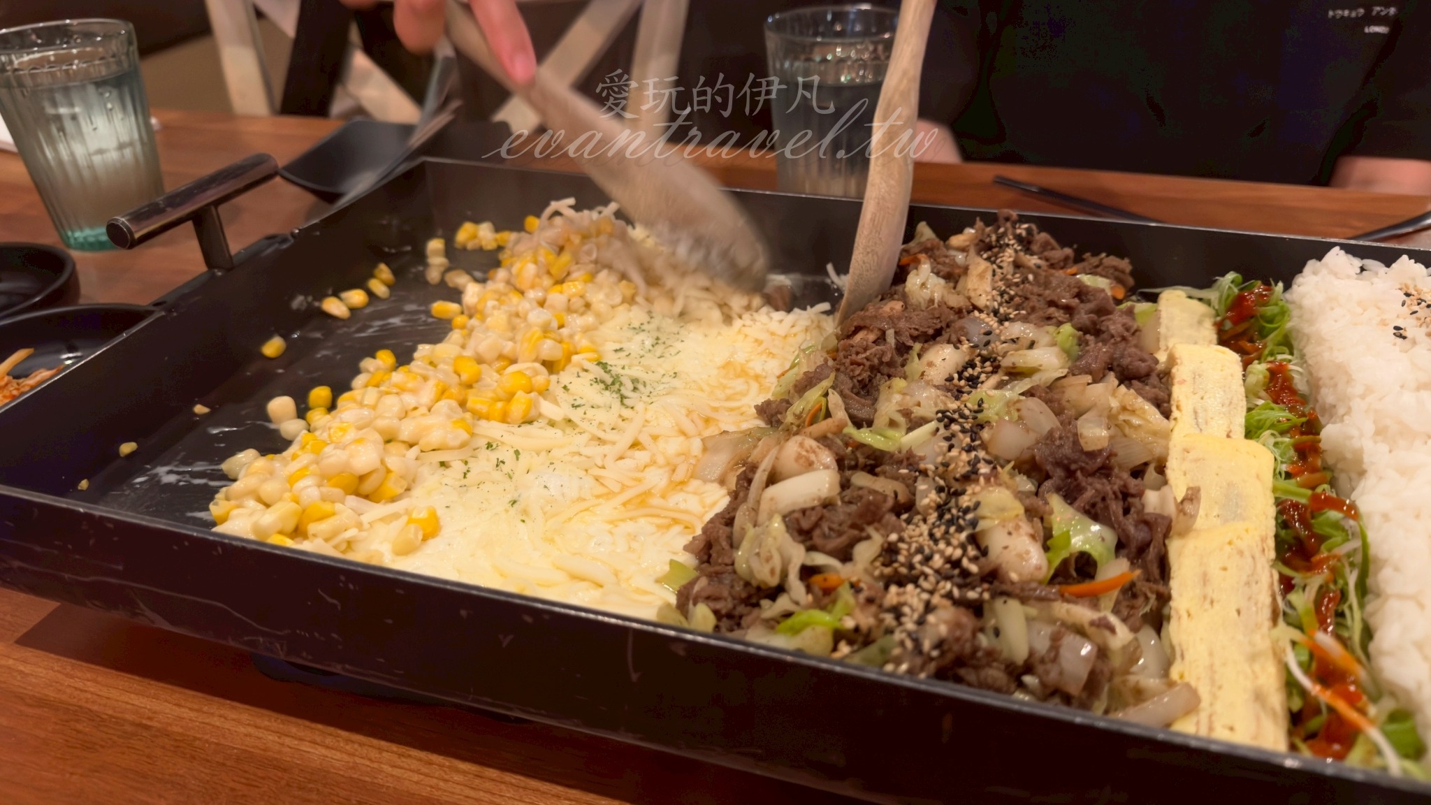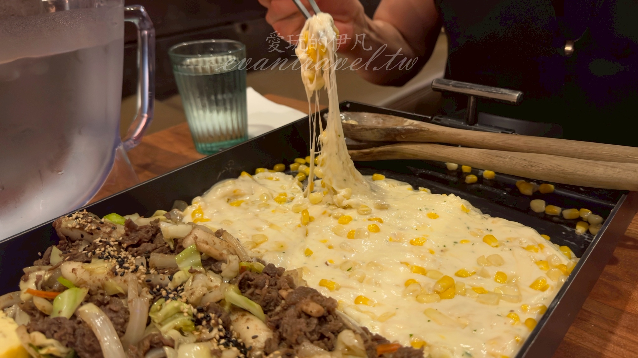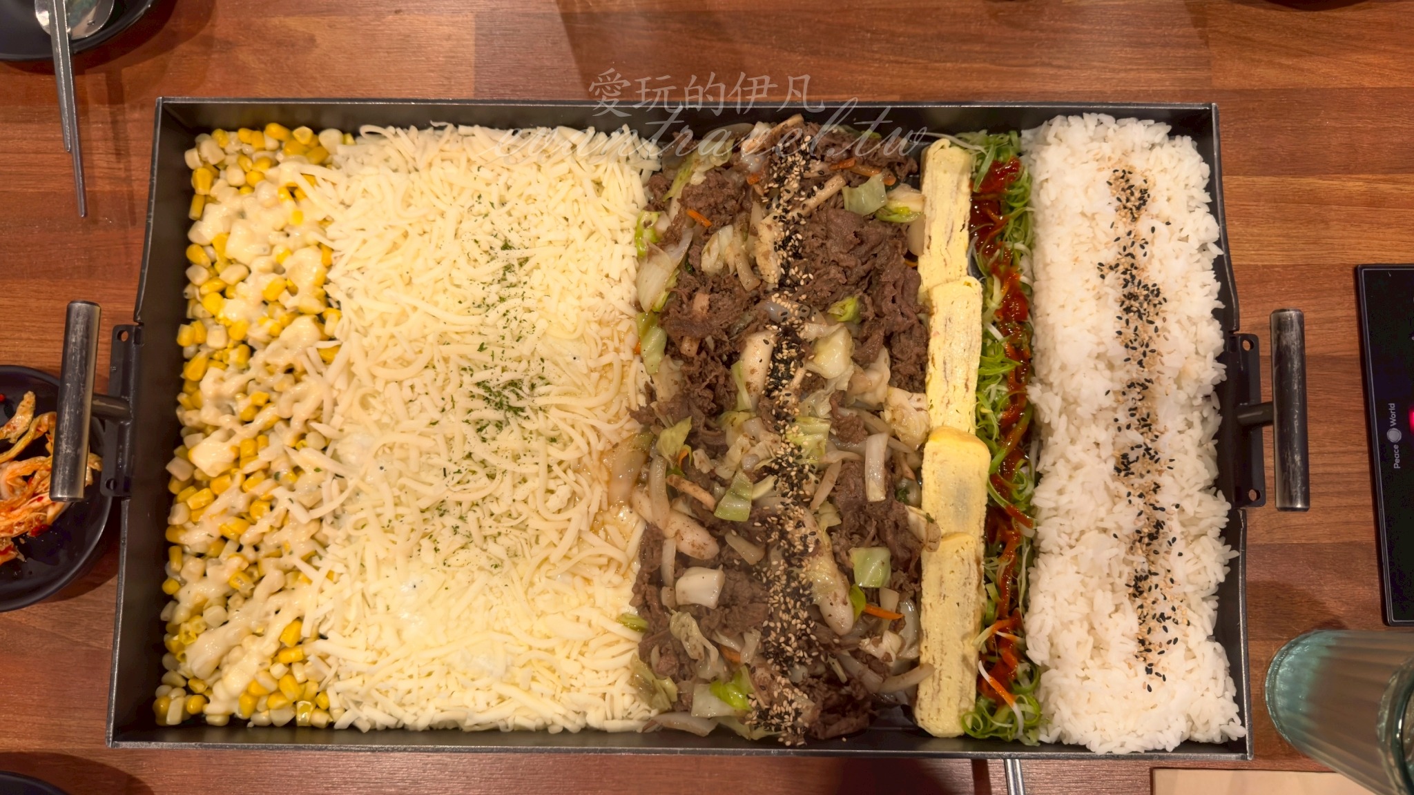 牛肉用韓式醬汁醃製,上桌時與一層融化起司、蔥花、玉米與自製蛋捲、米飯一同熱騰騰呈現,鹹甜交織中帶有韓式家常感。