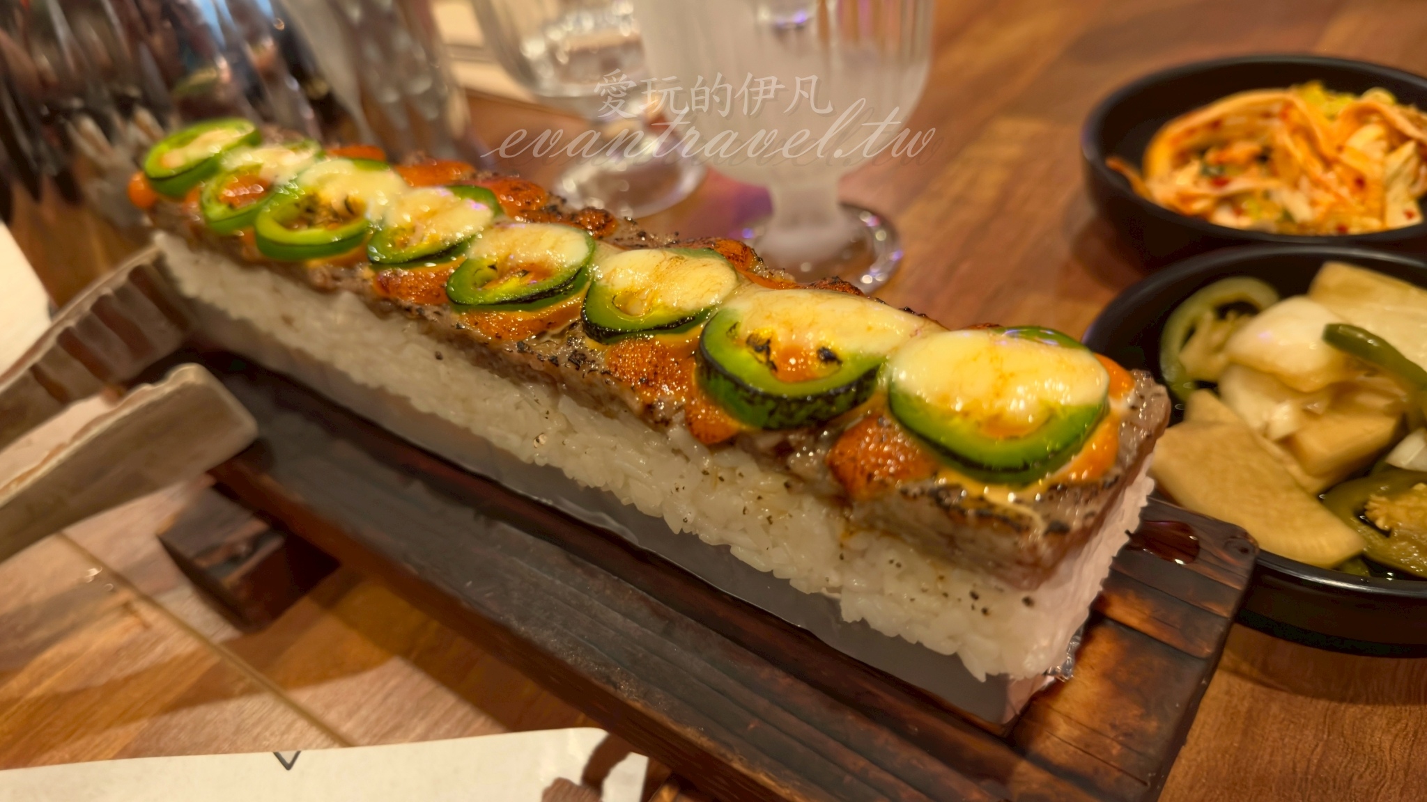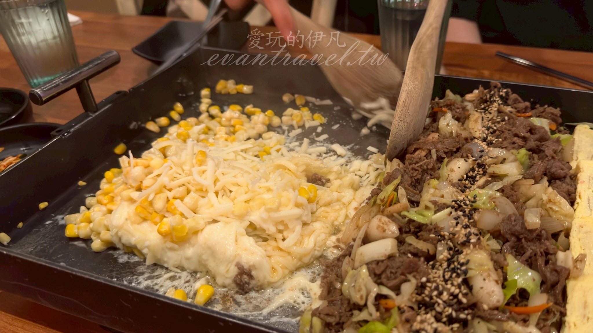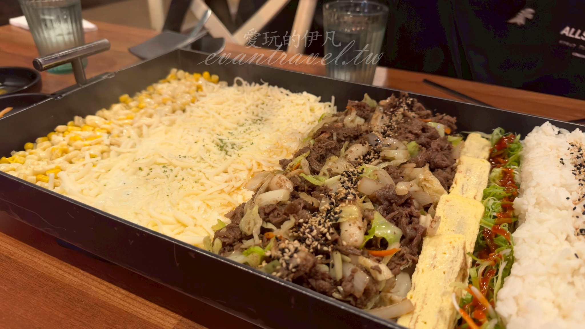 牛肉用韓式醬汁醃製,上桌時與一層融化起司、蔥花、玉米與自製蛋捲、米飯一同熱騰騰呈現,鹹甜交織中帶有韓式家常感。