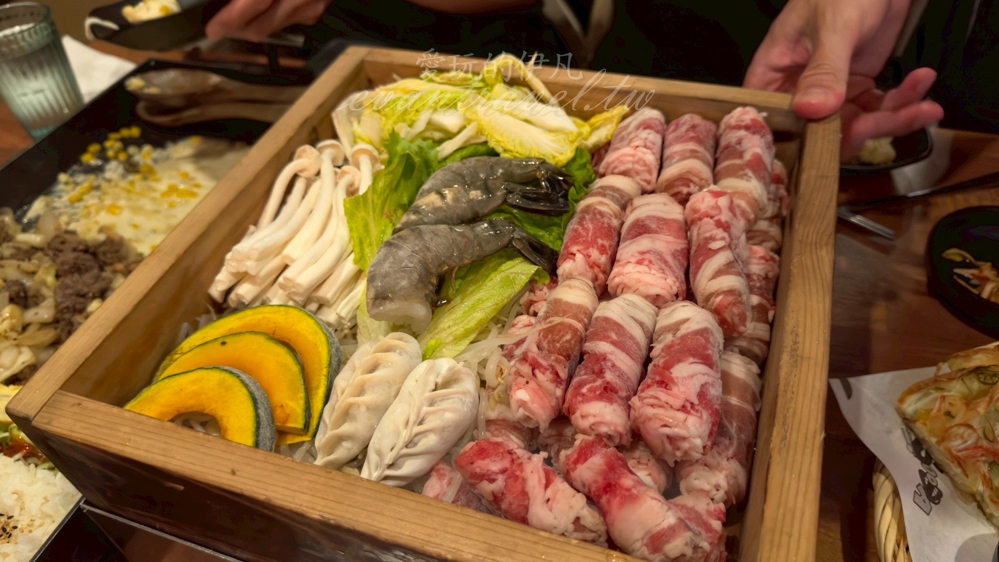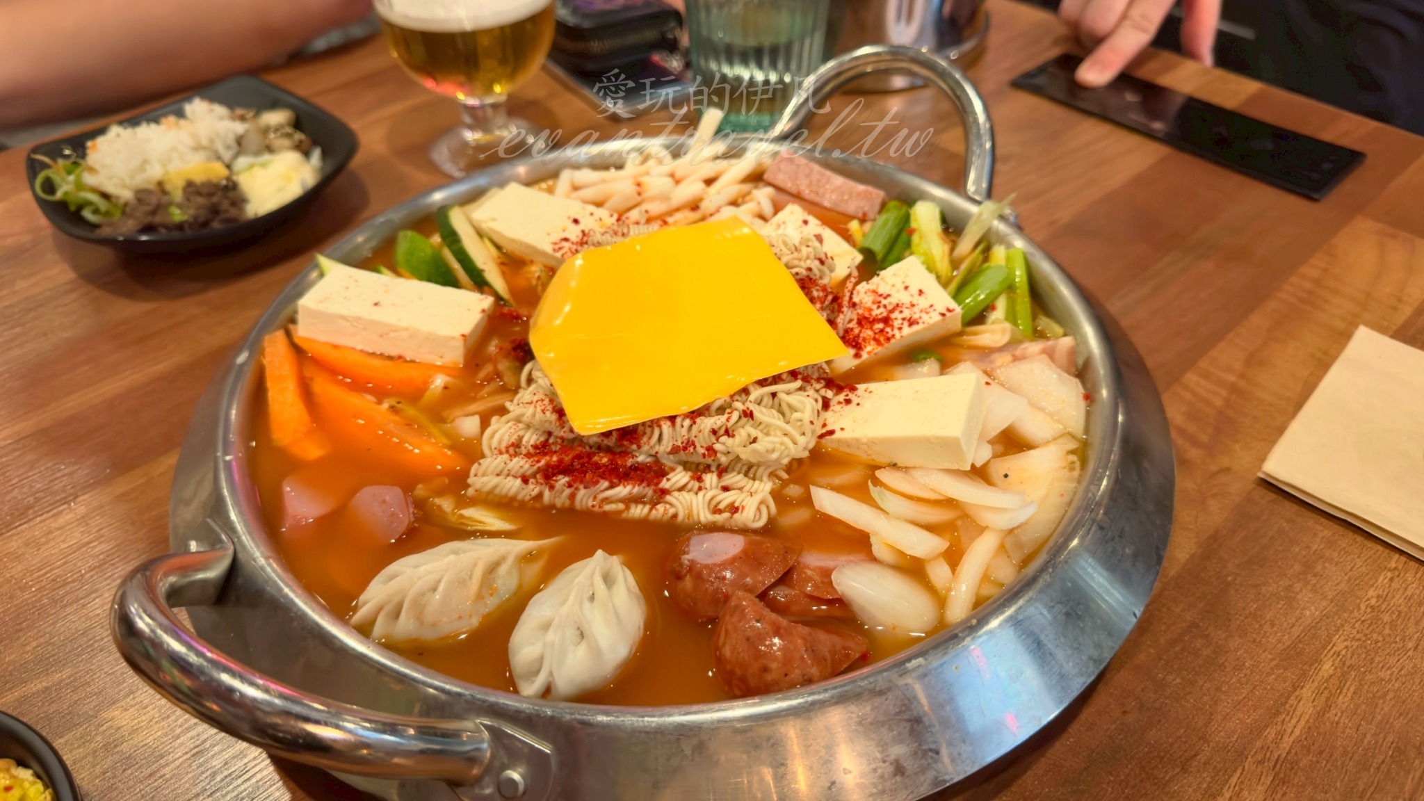 軍隊參戰風味火鍋,搭配培根、香腸、起司、菇類、餃子、年糕、泡菜、豆腐與麵條,口感豪邁飽滿,層次豐富。
