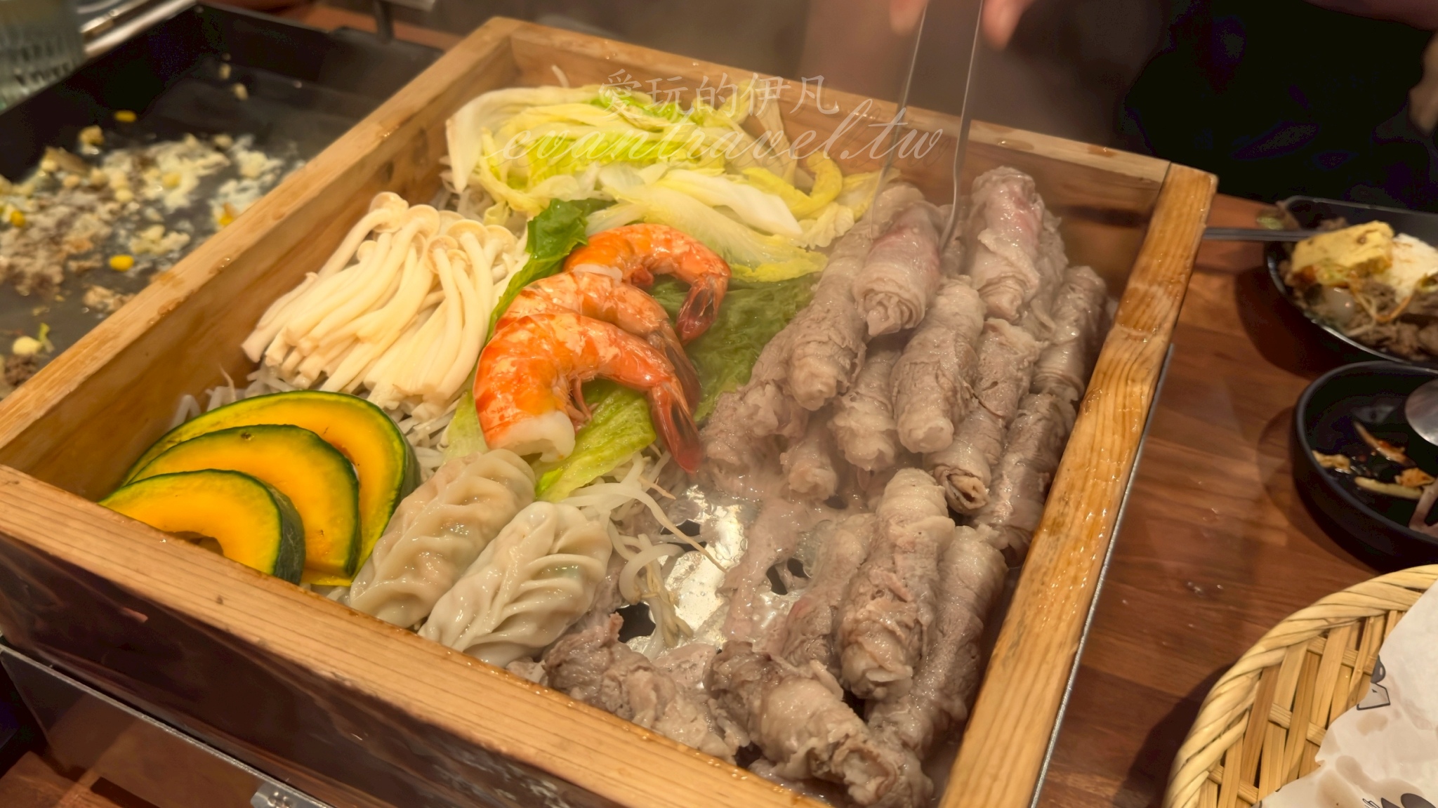 松木蒸版上搭配嫩 pastrami 牛肉、兩隻虎蝦、時蔬與餃子,香氣與海鮮滋味並存,清爽滋味令人印象深刻。