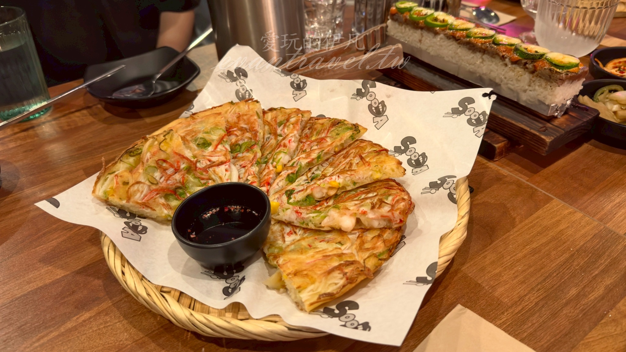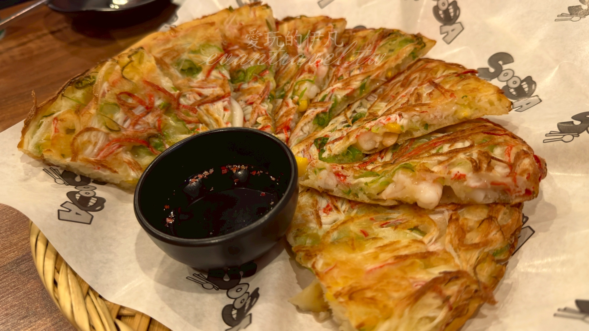 海鮮煎餅內有蝦、魷魚與蔥,煎至表層略焦,口感酥香。