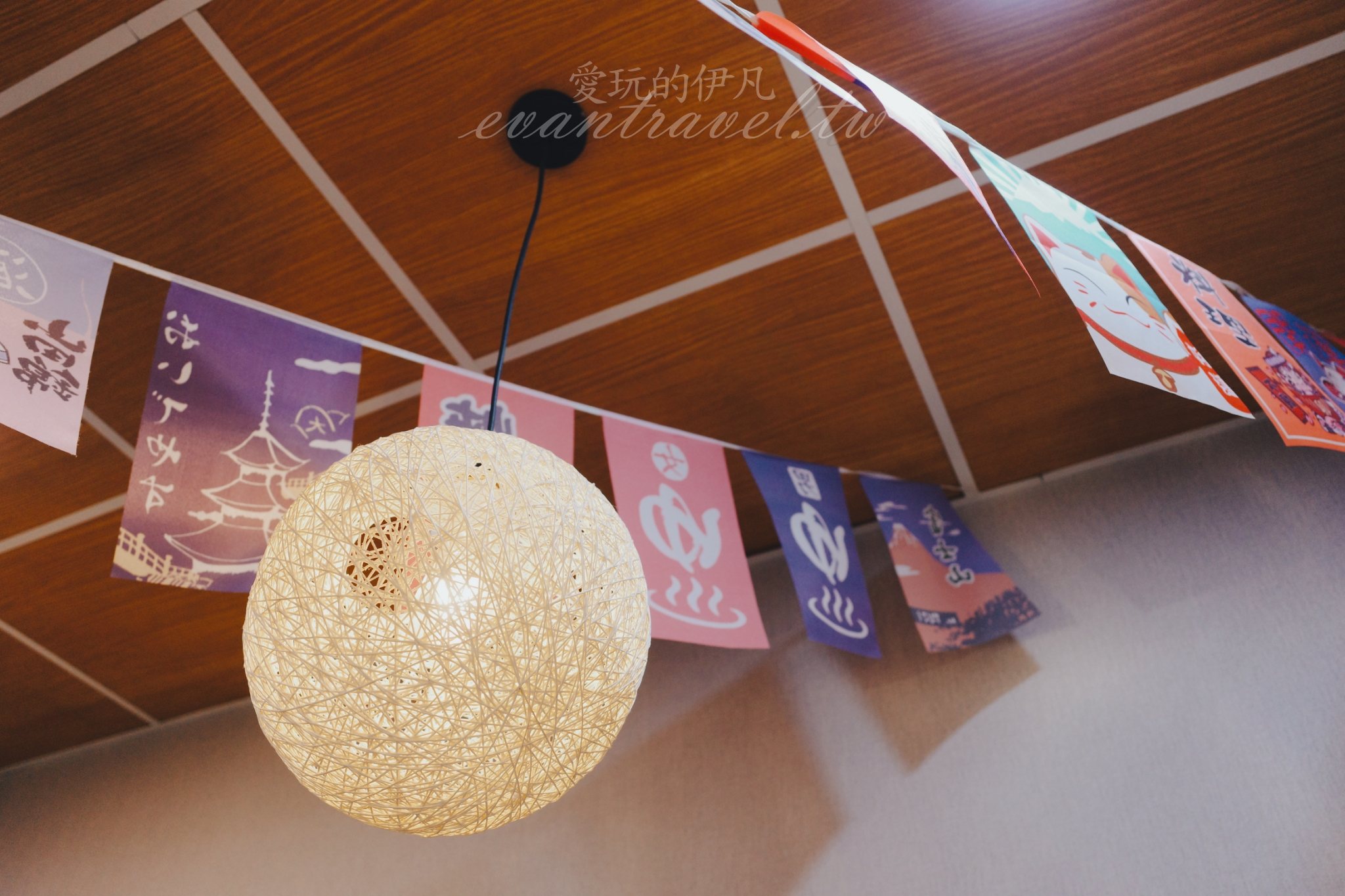 天花板上掛著一串串色彩斑斕的日式短旗,印有富士山、招財貓等元素,搭配編織感十足的球型吊燈,將日式居酒屋與現代食堂的風格完美揉合。