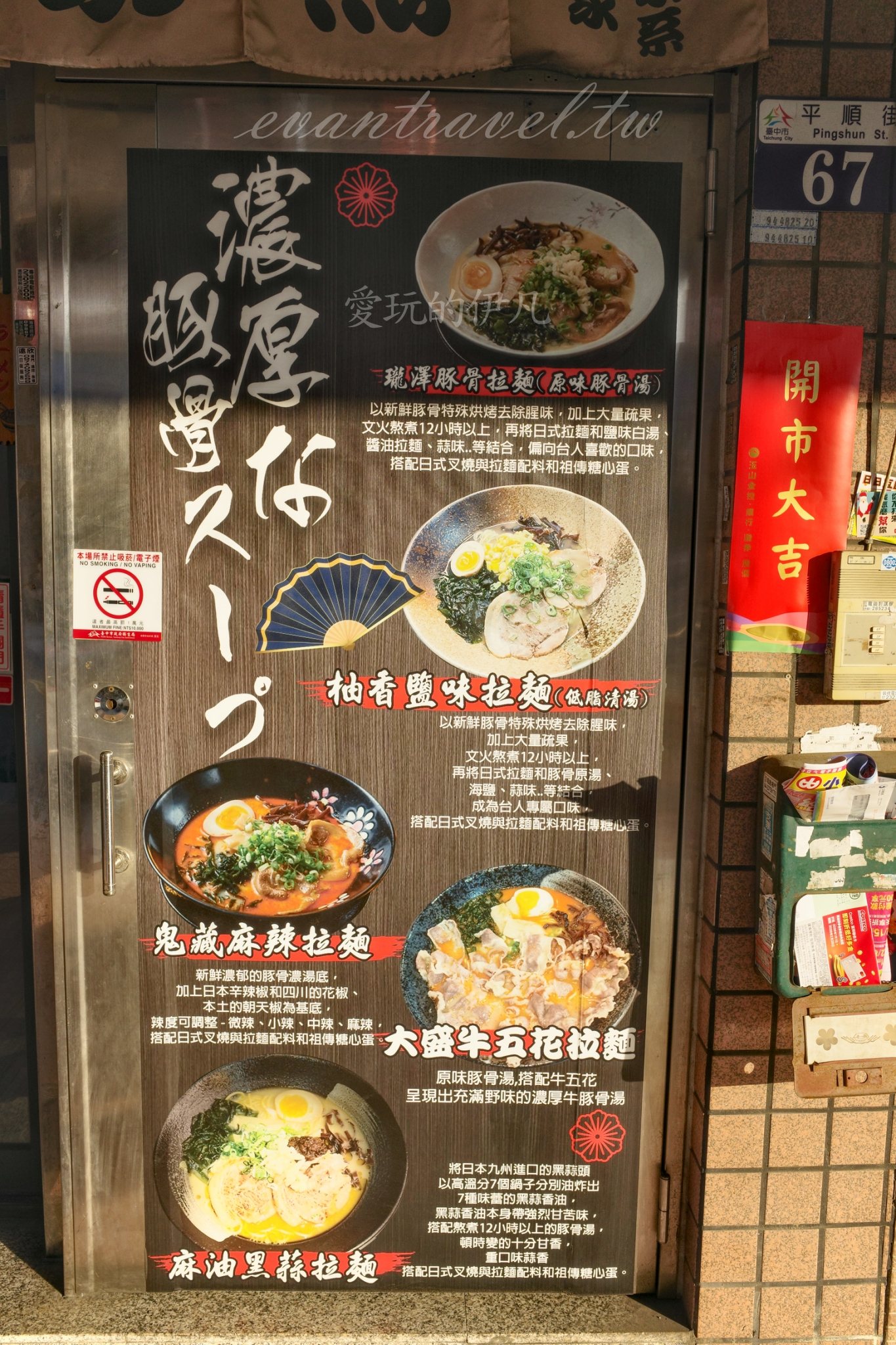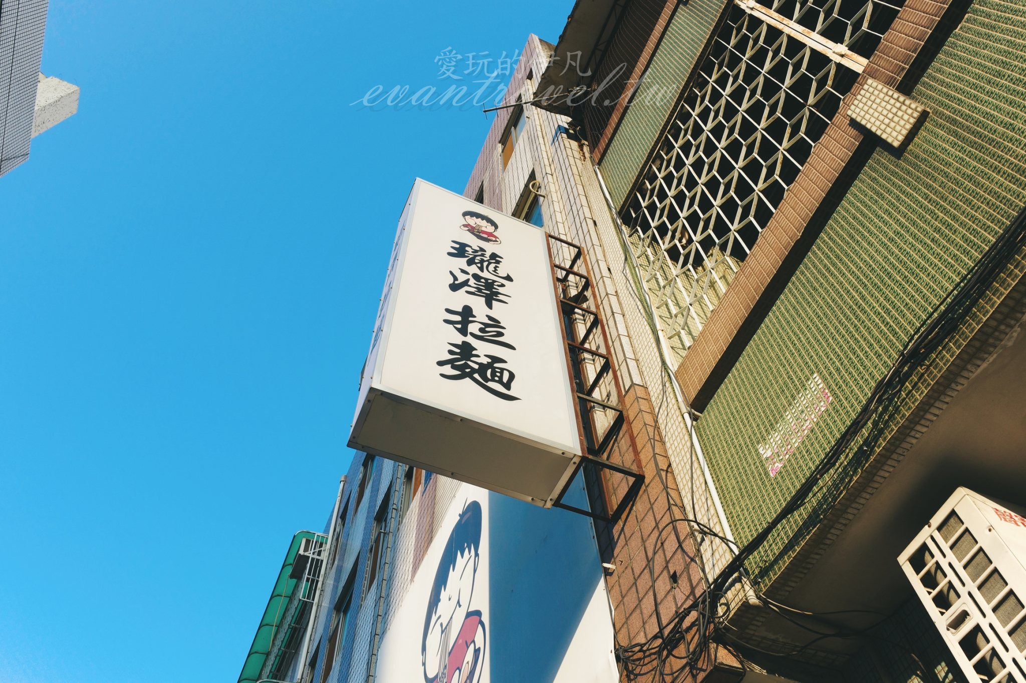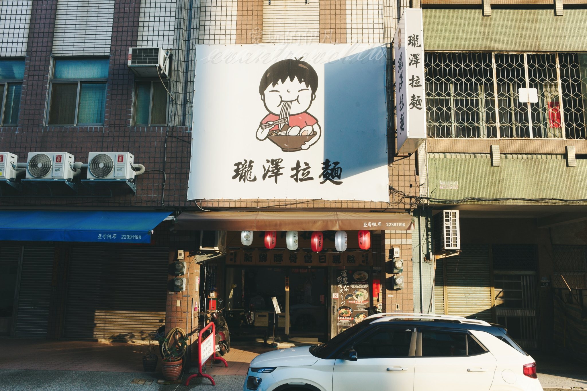 在台中南區的巷弄穿梭,總能遇見一些讓人流連忘返的職人小店。這天陽光正好,斜射的光影落在平順街的轉角,我遇見了瓏澤拉麵。遠遠地,我就被那巨大的、帶著童趣畫風的小男孩吸麵布條給吸引,簡單卻強烈的視覺符號,傳遞出一種「大口吃麵」的純粹幸福感。