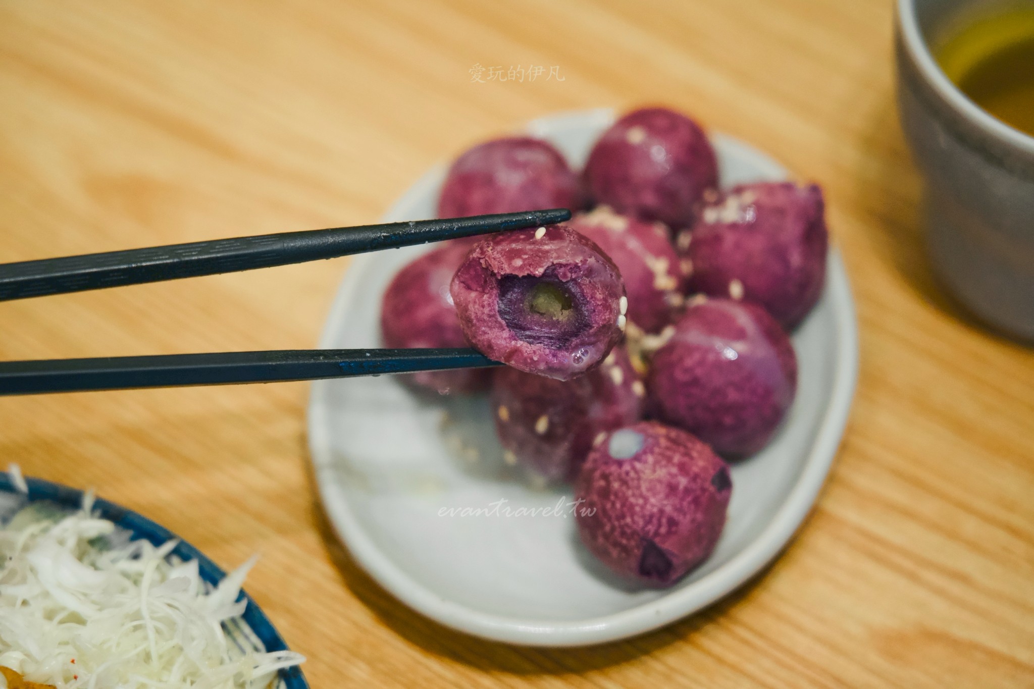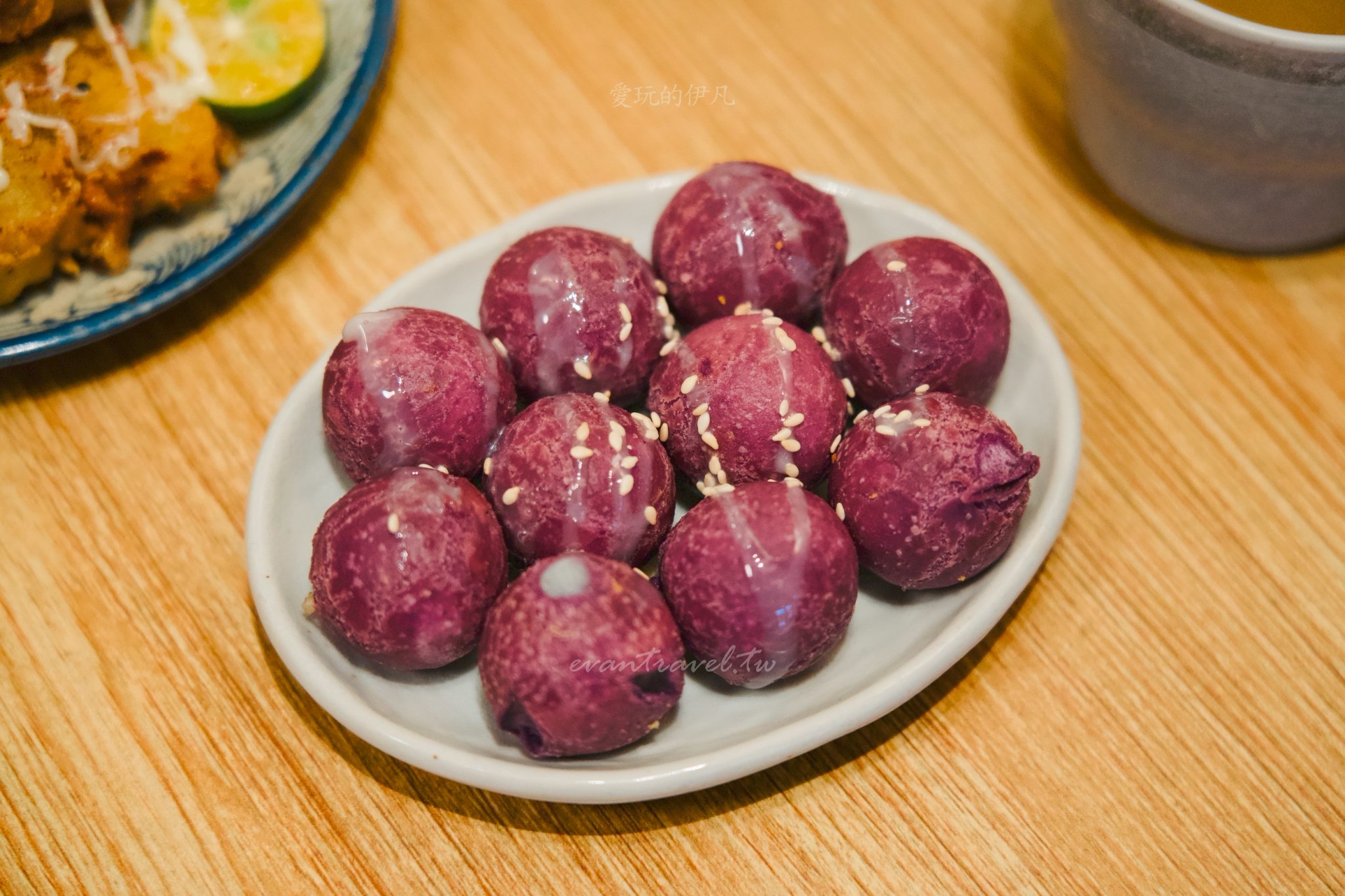 紫色與黃色交織的療癒外型,咬開後有飽滿的內餡,鹹甜適中,是絕佳的餐後甜點。